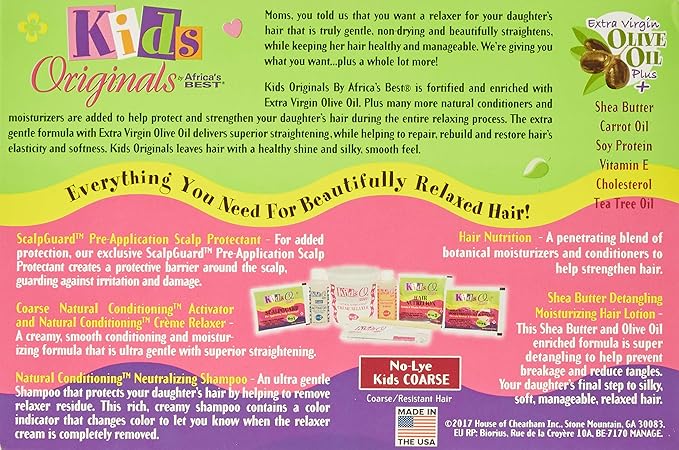 This hair relaxer kit is formulated specifically for children’s hair that is resistant or coarse. It typically includes ingredients such as extra virgin olive oil, shea butter, carrot oil, tea tree oil, and vitamin E to help protect hair during the straightening process.