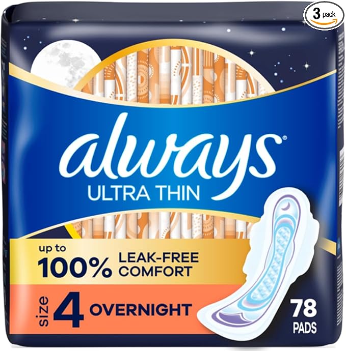 Always Ultra Thin Overnight Pads with Wings, Size 4, Overnight, 78 Count (3 Packs of 26)