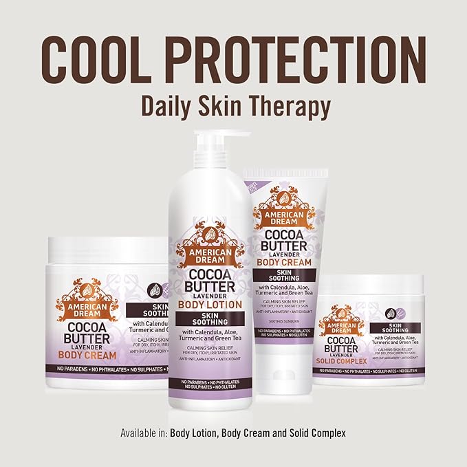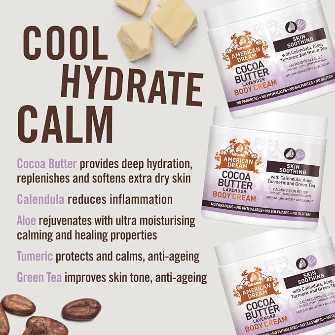 • Key Ingredients: Contains cocoa butter for deep moisturization, lavender oil for a calming and soothing effect, and vitamin E to help repair and protect the skin. It also includes natural ingredients like calendula, aloe, turmeric, and green tea for added anti-inflammatory and antioxidant benefits.