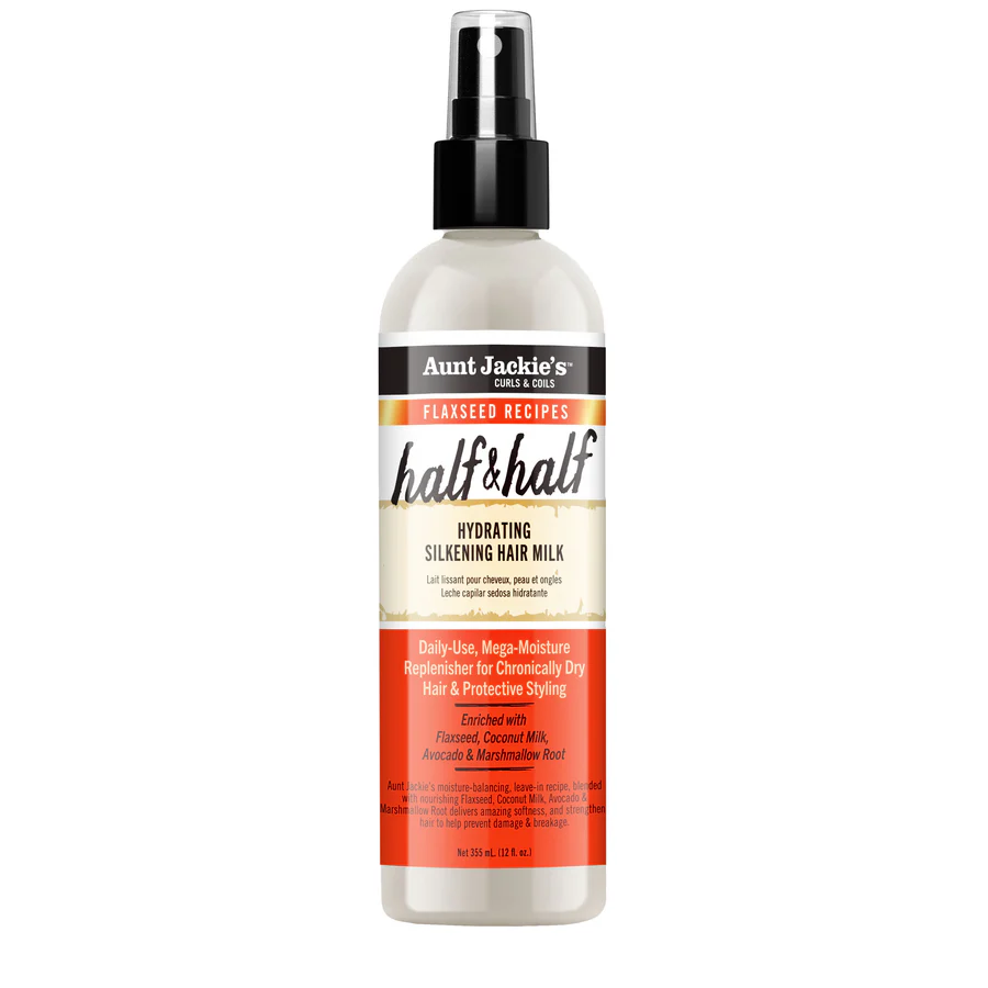 unt Jackie’s Half & Half Hydrating Silkening Hair Milk in the 355ml size is a moisture-balancing leave-in conditioner formulated with flaxseed, coconut milk, and avocado to hydrate, detangle, and soften natural hair.