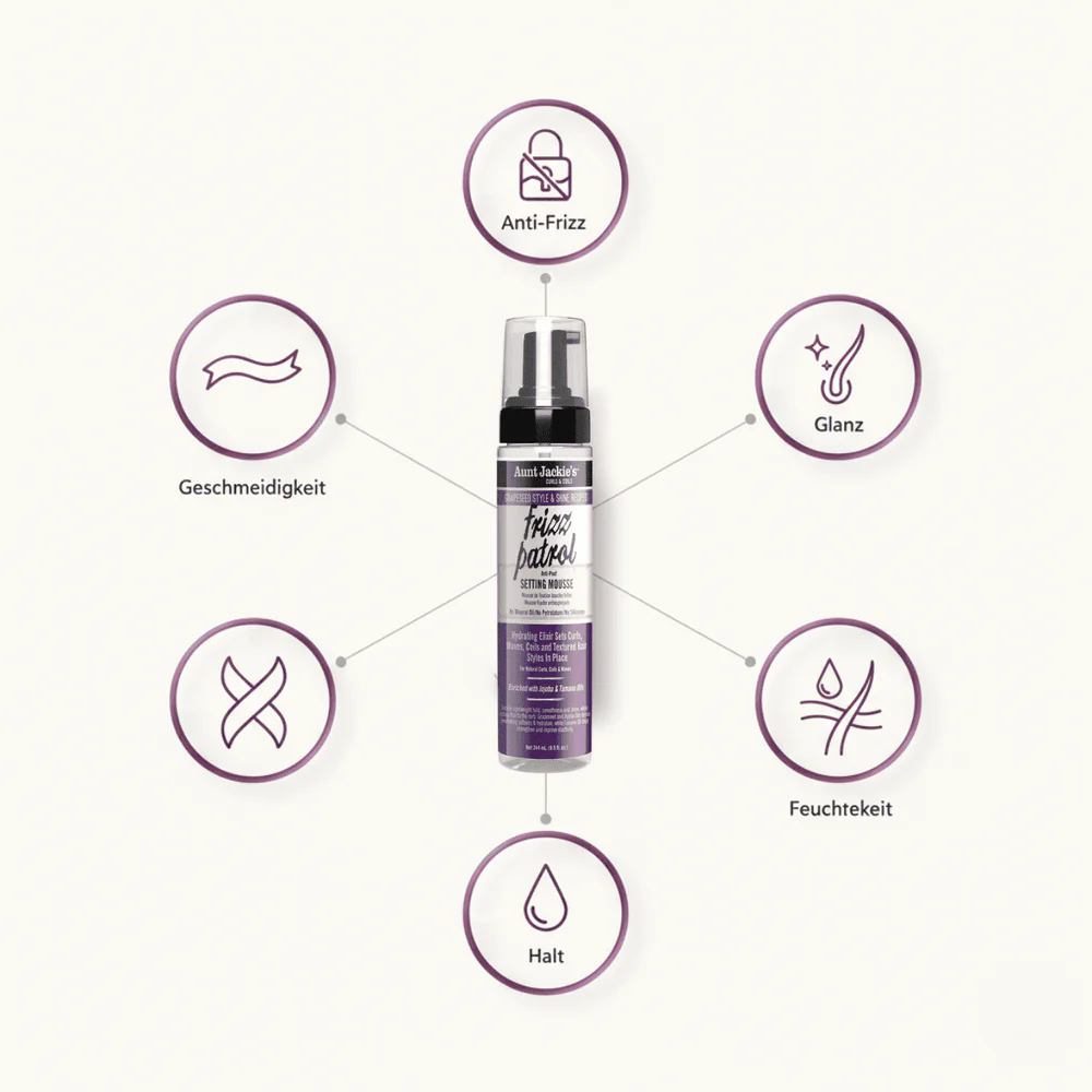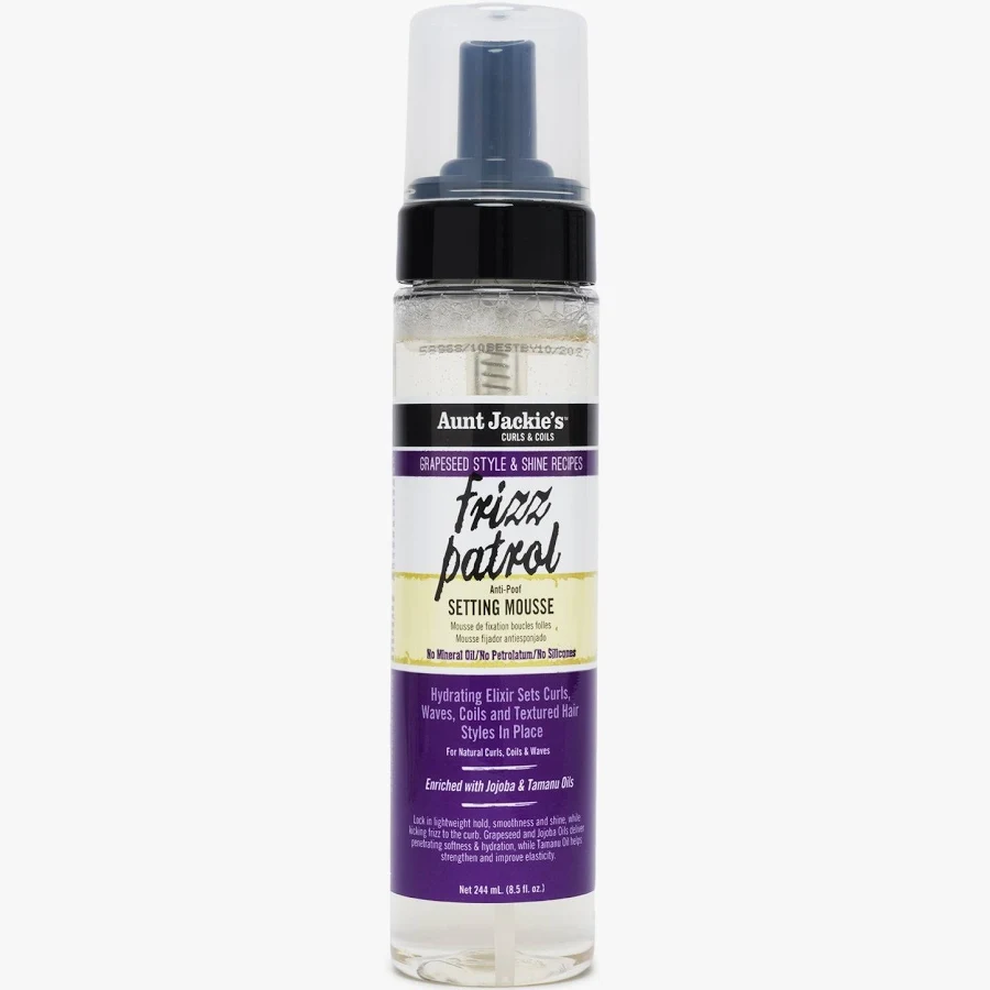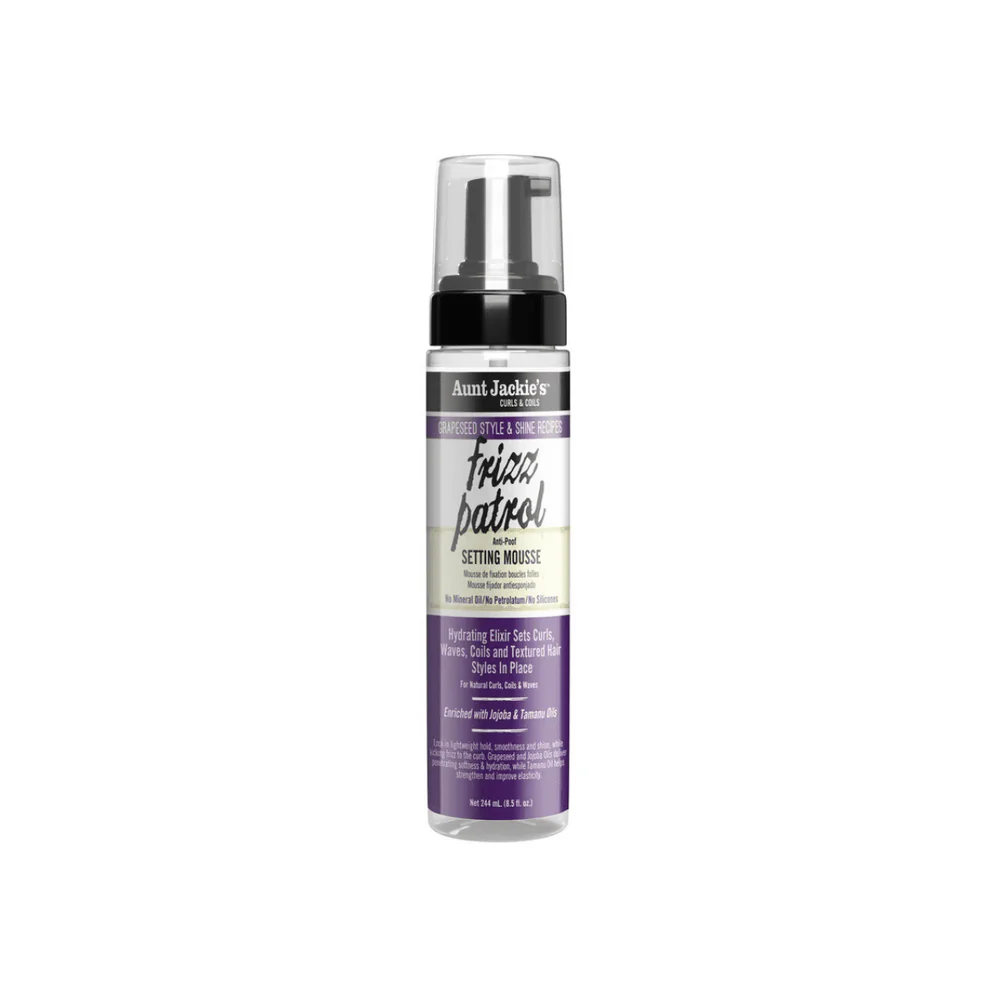 Aunt Jackie’s Grapeseed Frizz Patrol Anti-Poof Twist & Curl Setting Mousse (8.5 oz) is a lightweight styling foam designed to set textured hair styles while eliminating frizz.