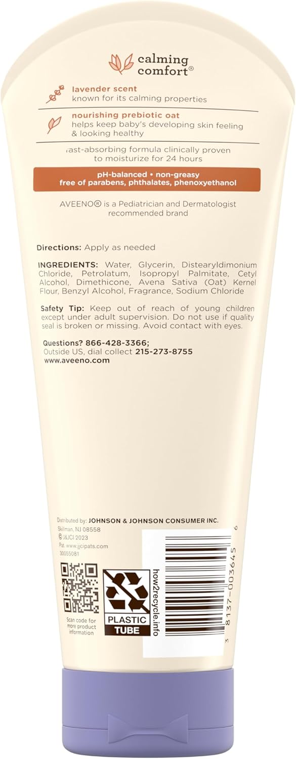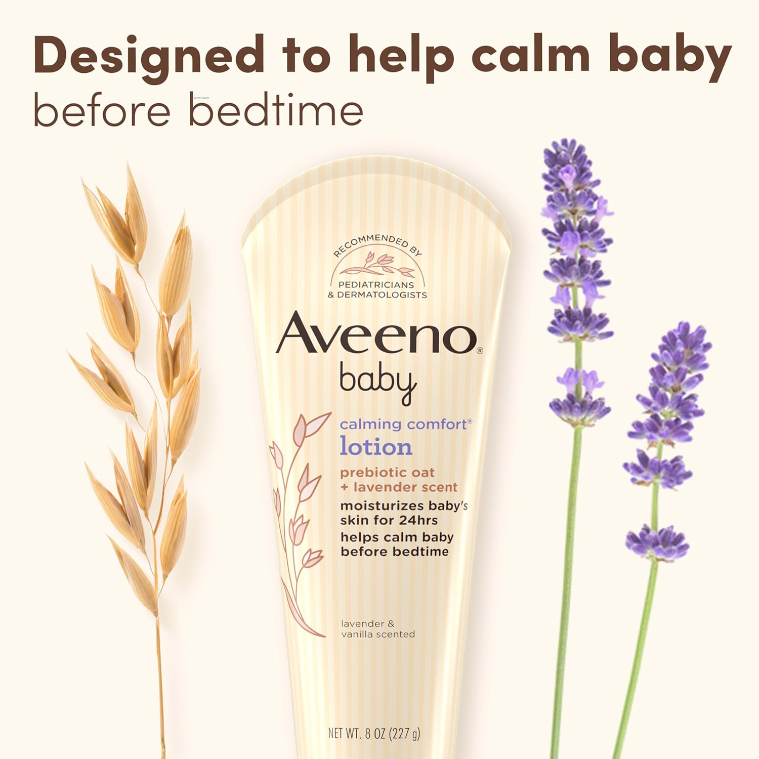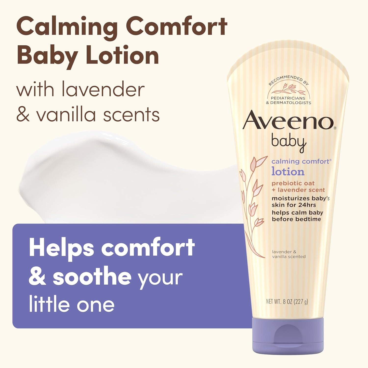 - SOOTHING BABY LOTION: 8-fluid ounces of Aveeno Baby Calming Comfort Moisturizing Body Lotion with relaxing lavender and vanilla scents to help comfort and soothe your little one at bedtime