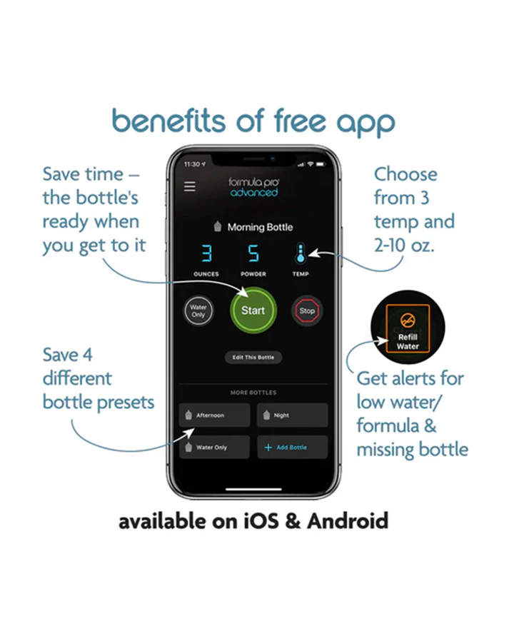 - Provides mobile alerts for bottle readiness, low formula/water, and no bottle detected.