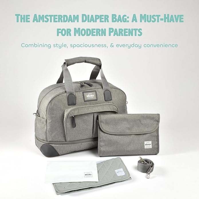 (also known as the Béaba Amsterdam Changing Bag) in the color Heather Grey.