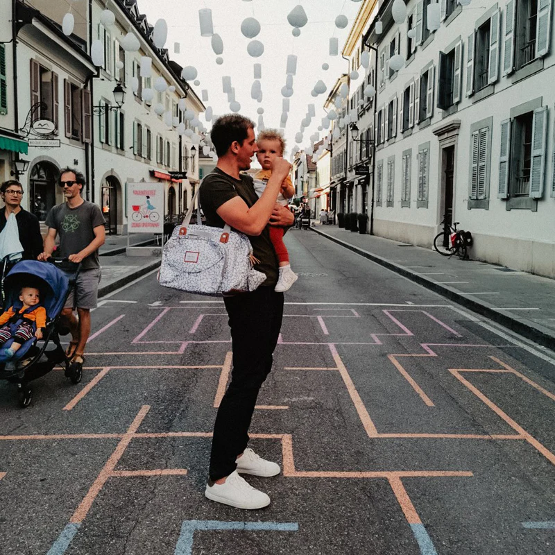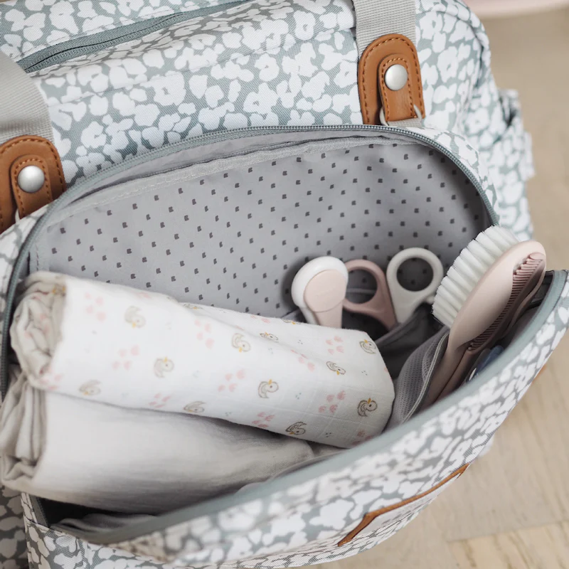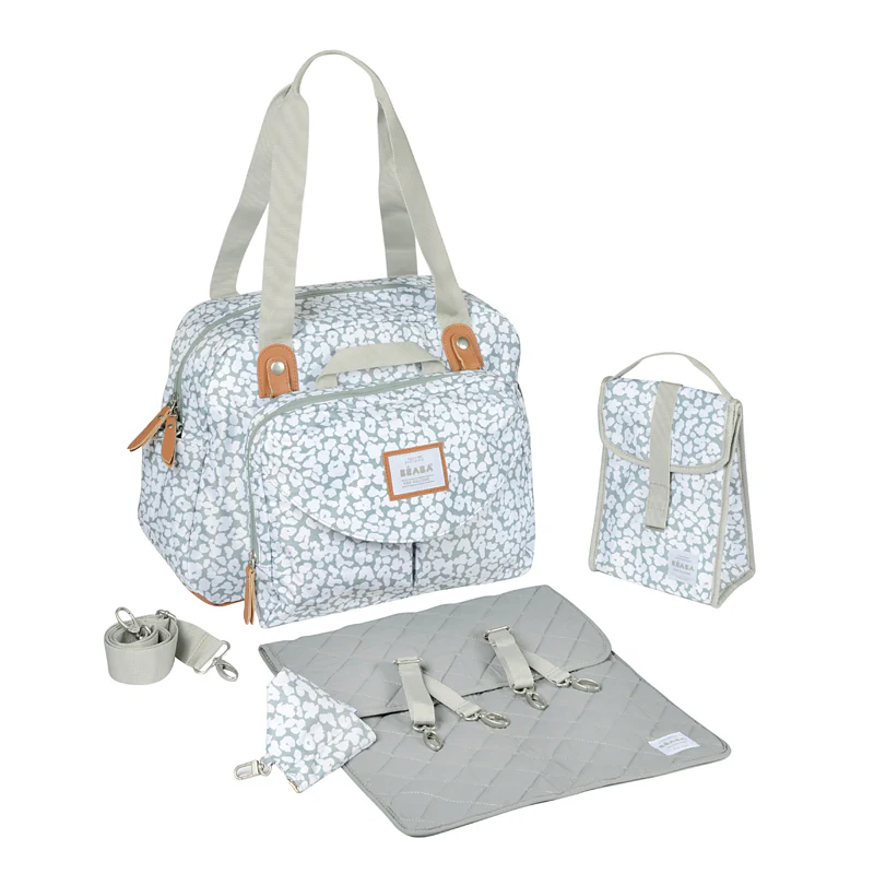 The changing bag has a wide opening for access to the main compartment and comes with an isothermal meal bag, dummy storage bag, changing mat, stroller straps and adjustable shoulder strap.