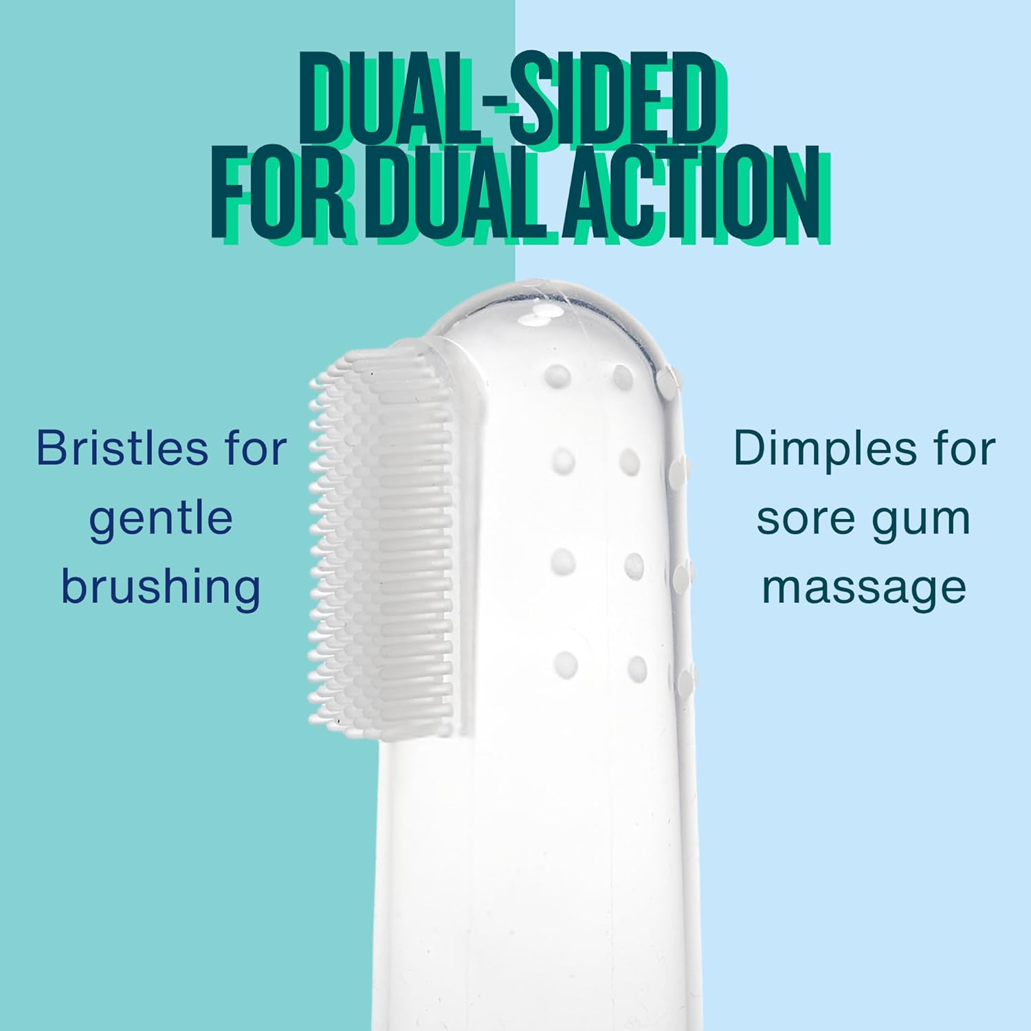 • Design: The silicone brush is double-sided, featuring soft bristles on one side for cleaning teeth and a dimpled surface on the reverse for soothing gum relief.