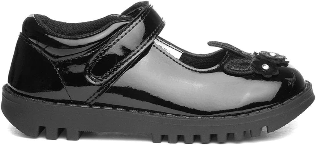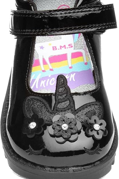 From Buckle My Shoe, these Castle girls’ shoes showcase a round toe front and a sleek patent black upper. The easy fasten strap ensures quick and easy fitting, making them an ideal choice for rushed school mornings. Designed with support and comfort in mind, these shoes have a cleated gripped outsole, ideal for both school and playground activities. Adding a touch of fun, they are finished with a charming 3D unicorn design. For up to 1 years old we would recommend infant size 3-4, 2 year olds a size 5-6, 3 year olds a size 7-8, 4 year olds a size 9-10, 5 year olds a size 10-11, 6 year olds a size 11-12, 7 year olds a size 12-13, 8 or 9 year olds a size 1-2 and 10-11 year olds a junior size 3-4.