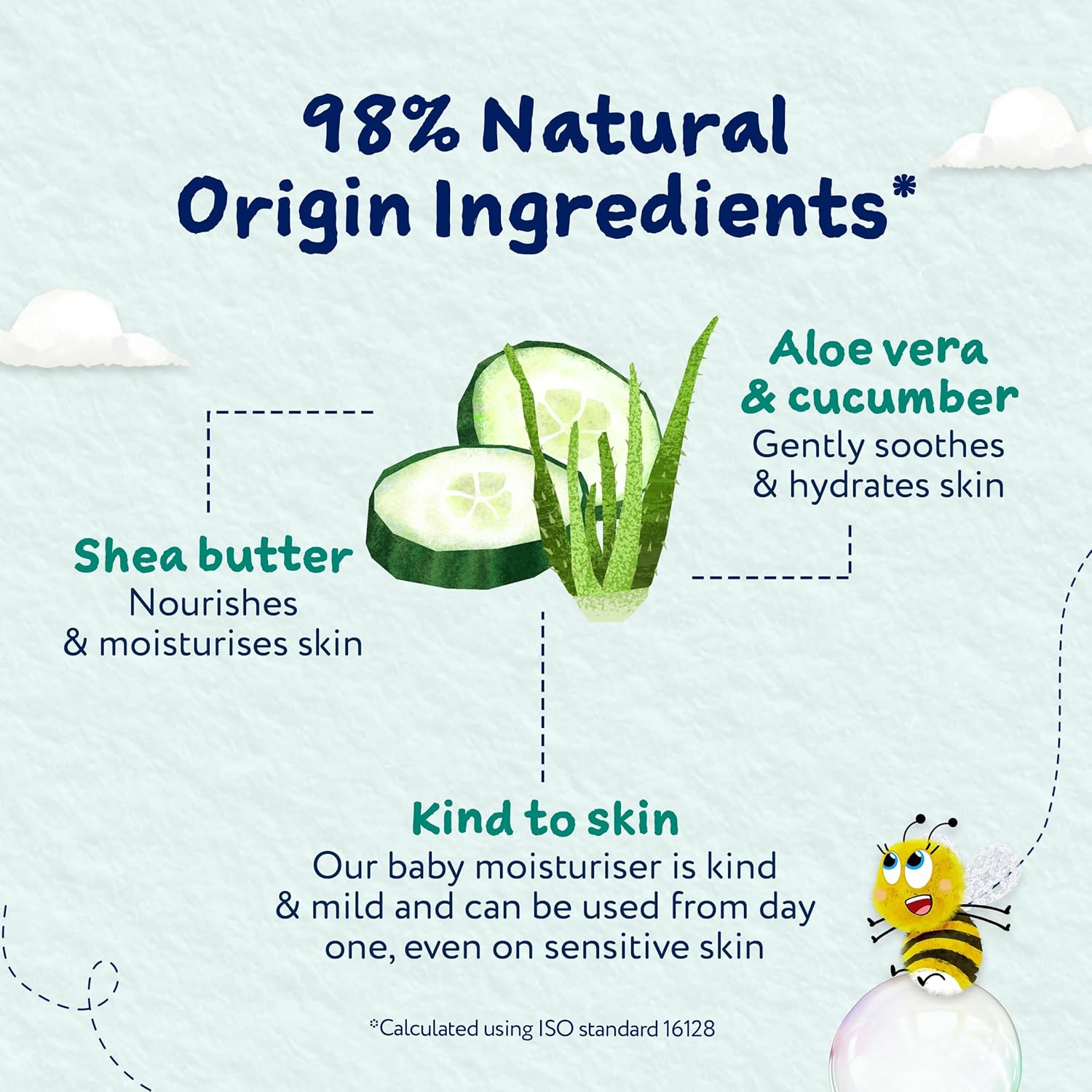 - Contains 98% natural origin ingredients (calculated using ISO standard 16128) including skin-soothing aloe vera, cucumber, cocoa butter and shea butter.