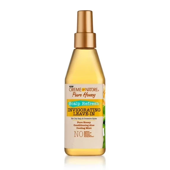 The Crème of Nature Pure Honey Scalp Refresh Invigorating Leave-In Conditioner is a lightweight spray that hydrates the hair and provides a cooling sensation to the scalp, making it ideal for use between washes and with protective styles like braids and locs.