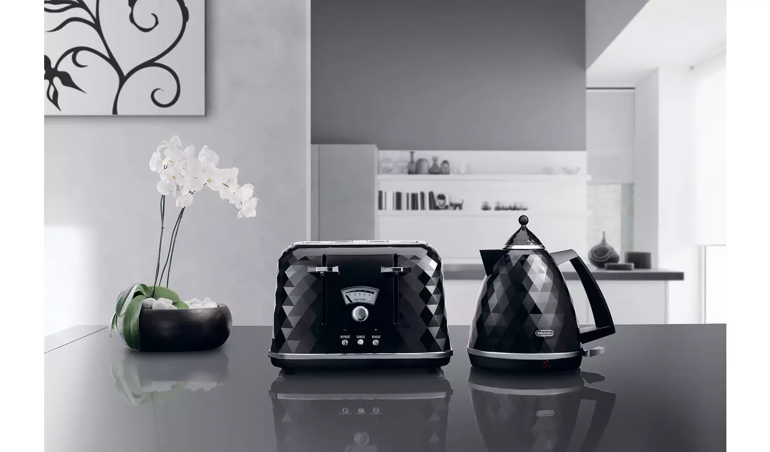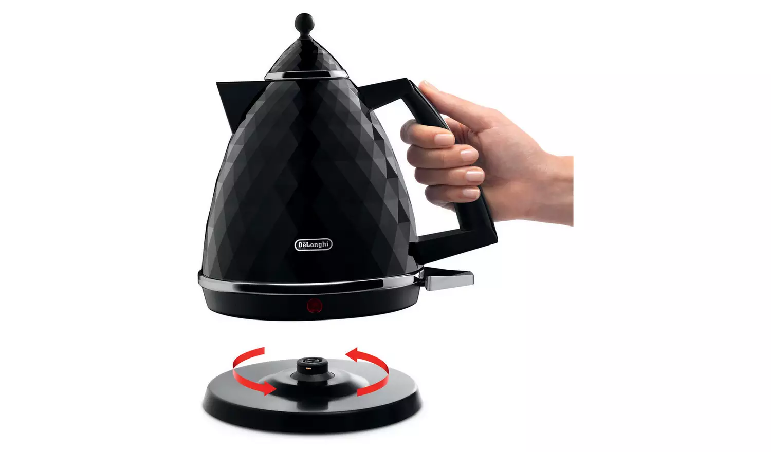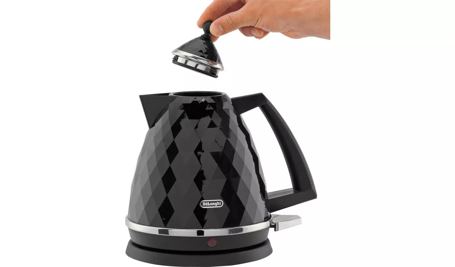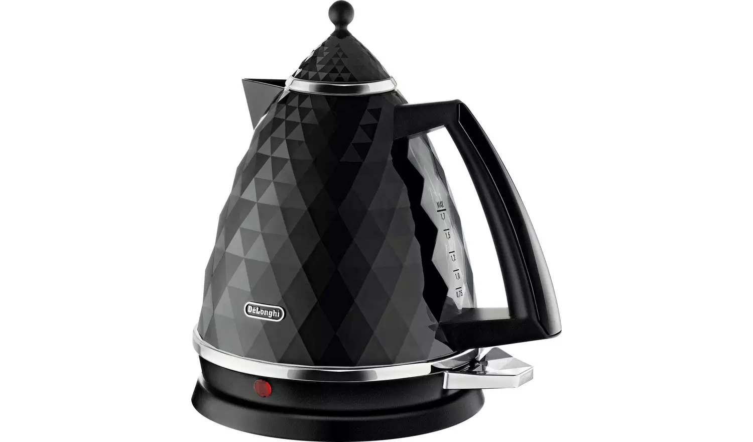 Add a touch of style to your kitchen with this De’Longhi Brillante Kettle – uniquely textured and designed, with multi-faceted high gloss finishing and chrome details. Complete with 360 degree swivel base for easy use, water level indicator for just the right amount and auto shut off.