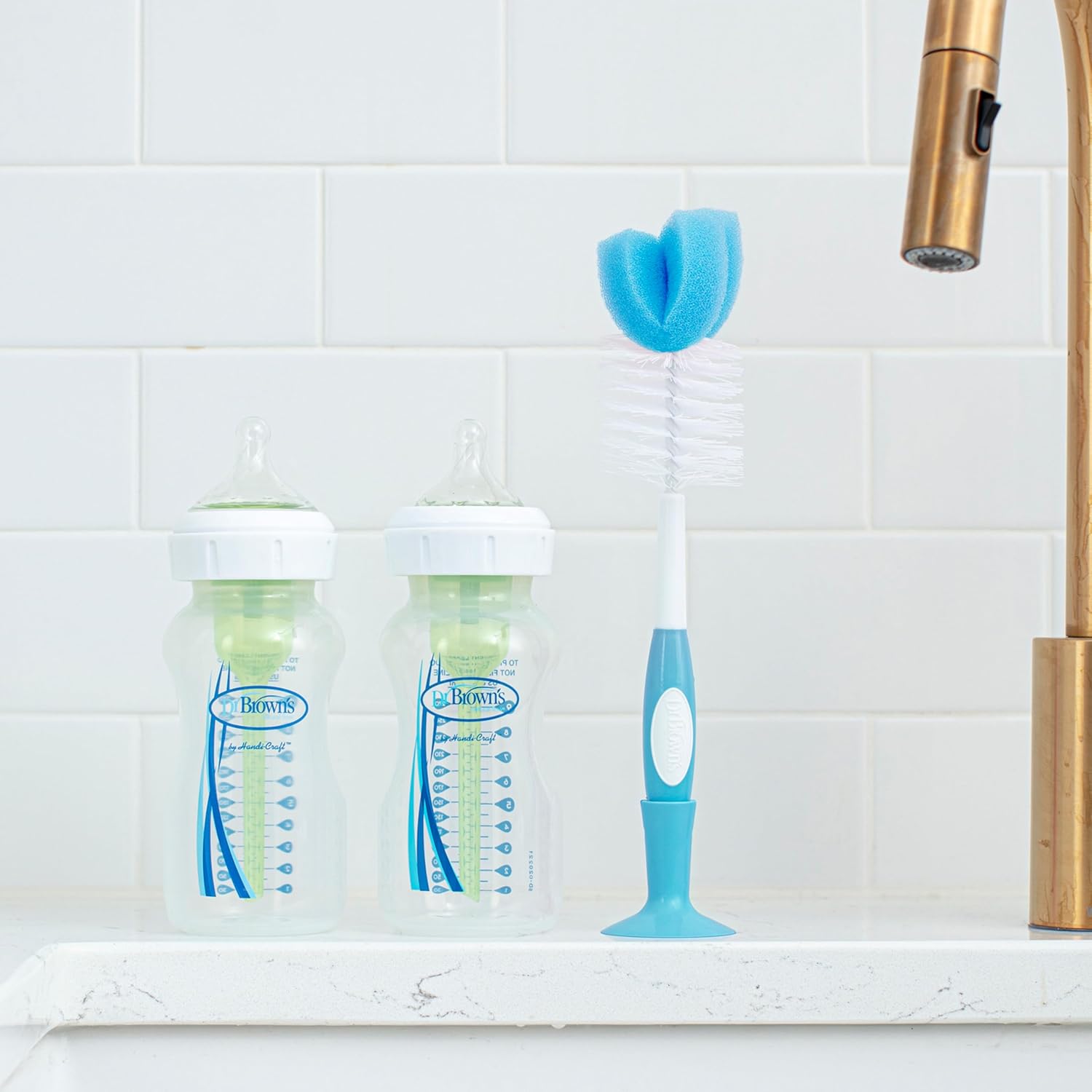 The grooved, no-slip handle features a specially-designed ridged teat cleaner in the base to clean your Dr. Brown’s bottle teat.