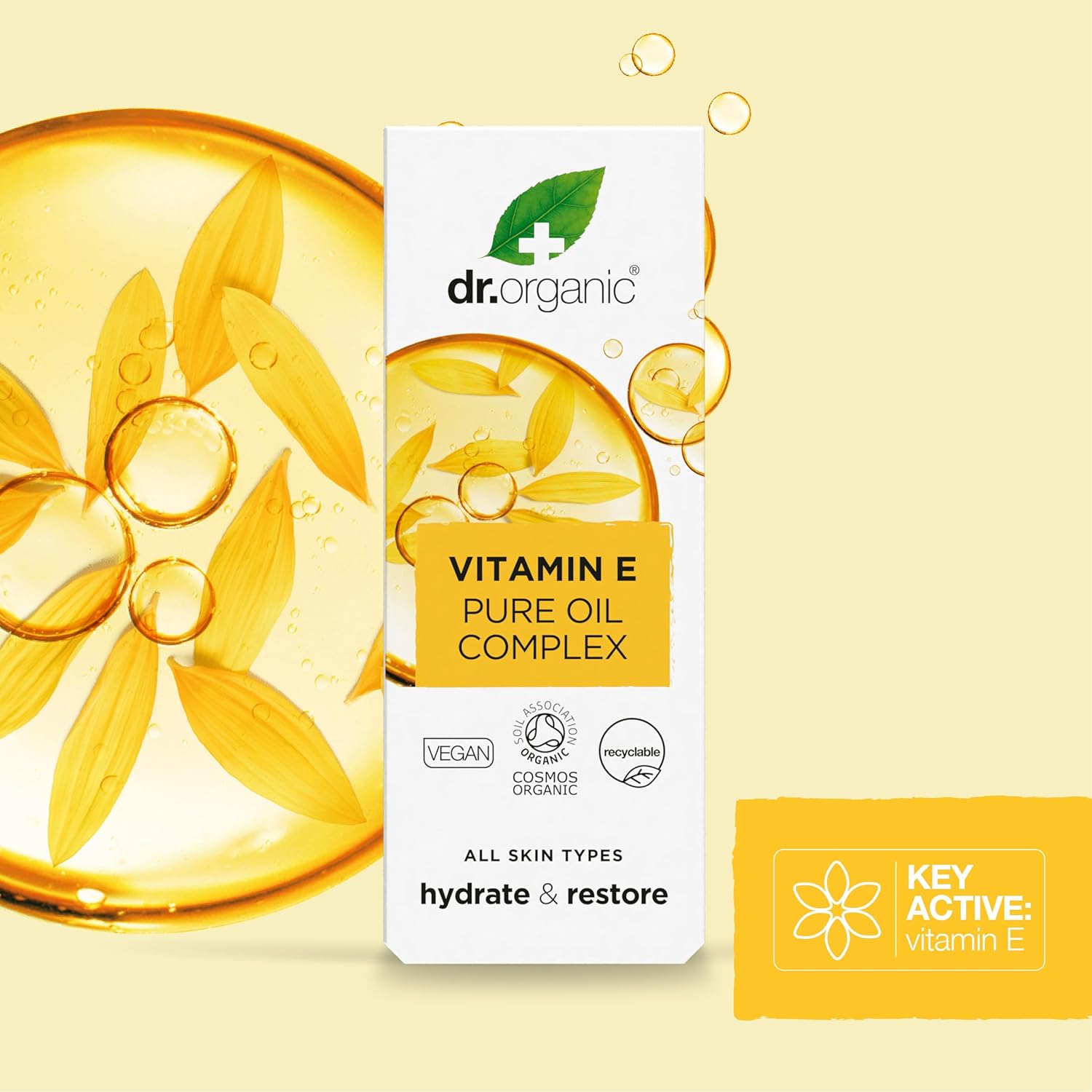 Dr. Organic Vitamin E Pure Oil Complex 50ml, a bioactive skin oil designed for moisturizing and skin restoration.