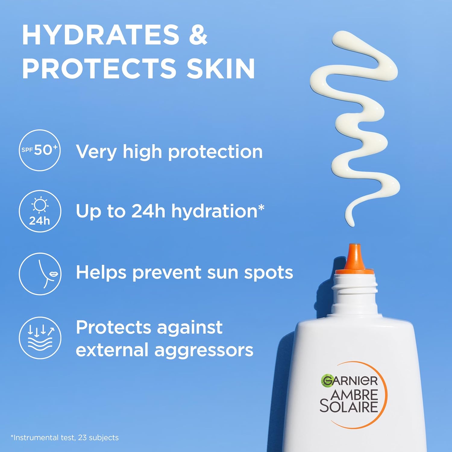 Garnier Ambre Solaire Anti-Dark Spots & Anti-Pollution Super UV Protection Fluid SPF 50+. This is an ultra-light facial sunscreen designed for sensitive skin, formulated to provide high broad-spectrum protection while offering daily hydration.
