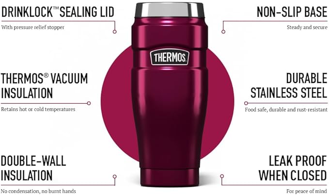 • Temperature Control – Thermos vacuum insulation keeps your coffee cup contents hot for 7 hours or cold for 18, maintaining optimal temperature for your beverages throughout the day