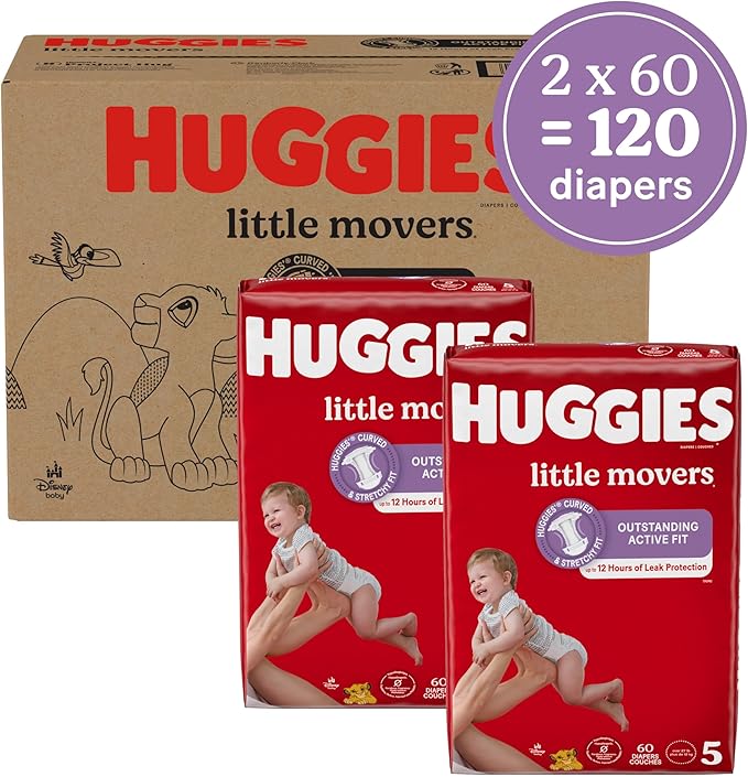 - Huggies Size 5 Diapers: 120 Little Movers Baby Diapers (2 packs of 60), size 5 (27+ lbs); packaging may vary
