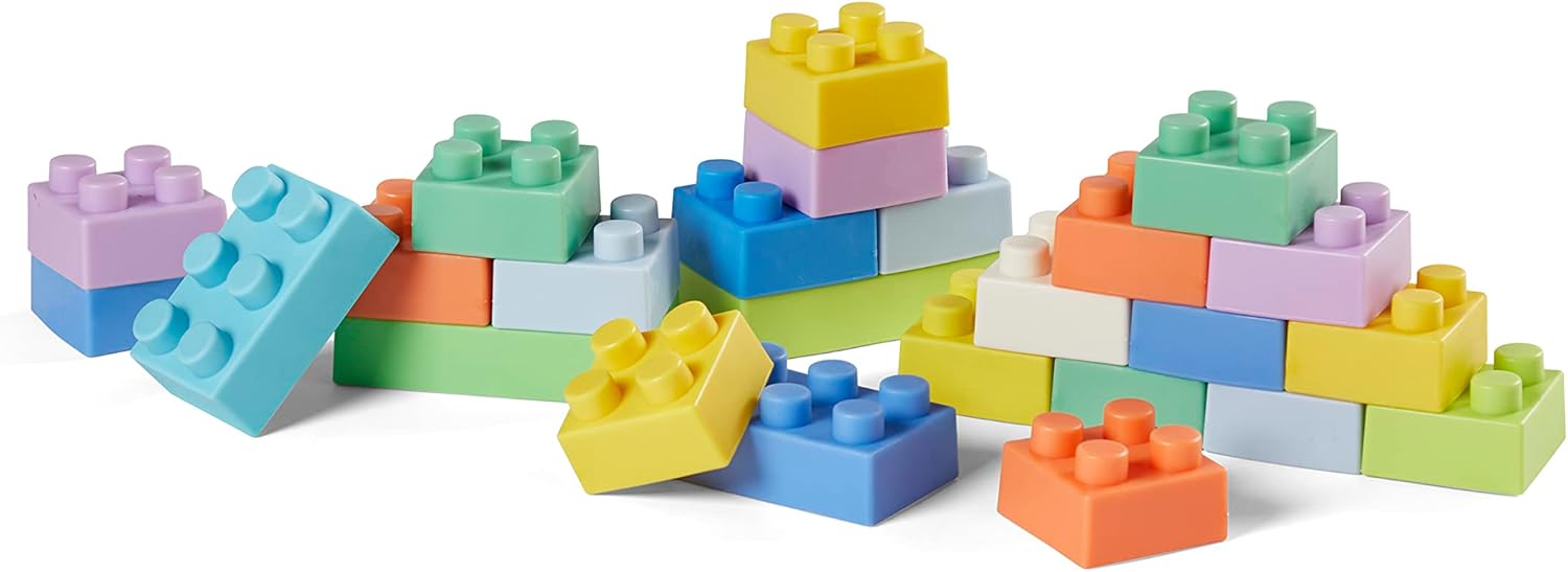 The Goods: A 25-piece set of vibrant, squeezable, and stackable blocks in various sizes.