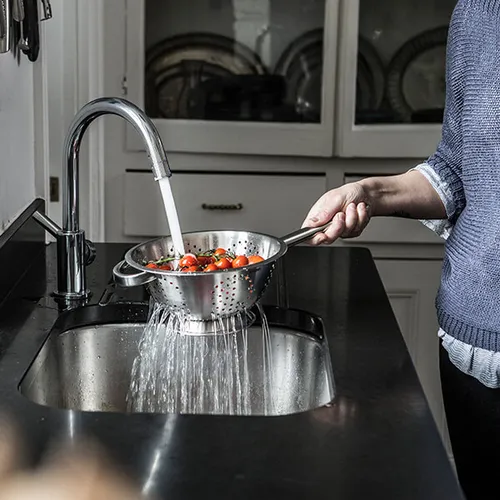 This kitchen essential is designed for draining pasta and rinsing vegetables, featuring: