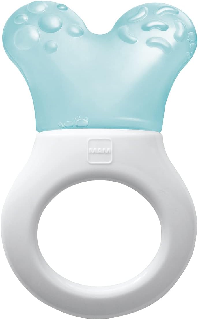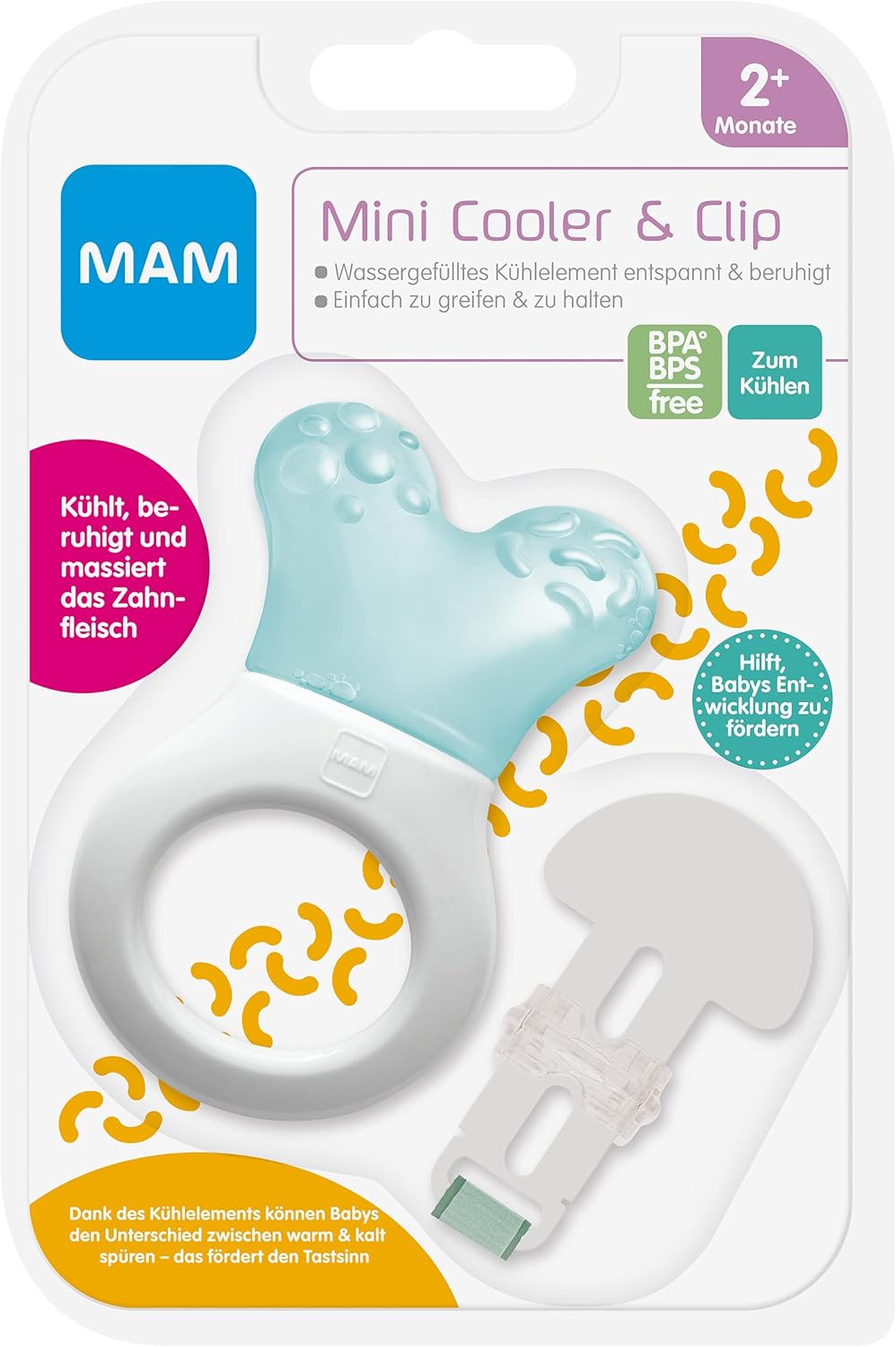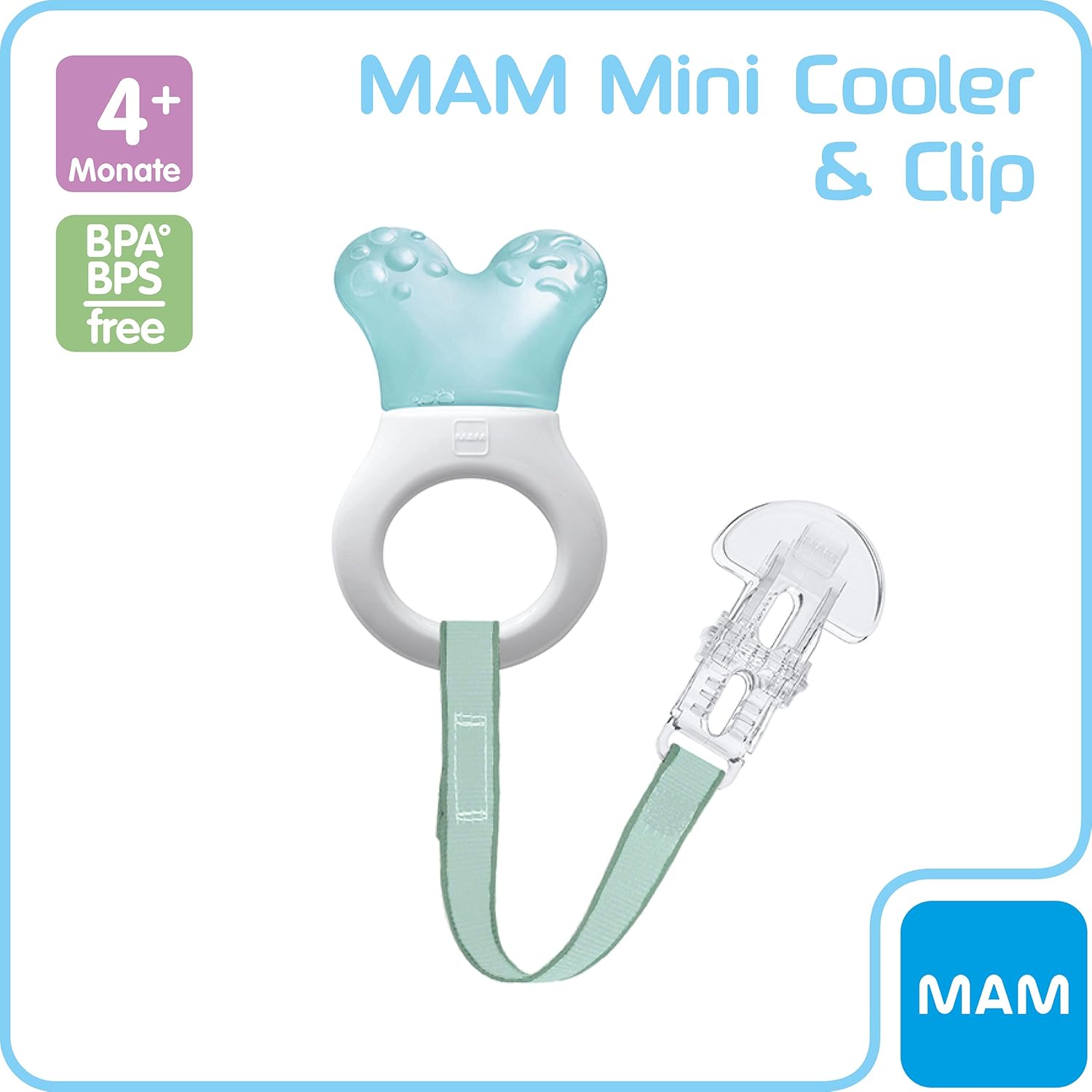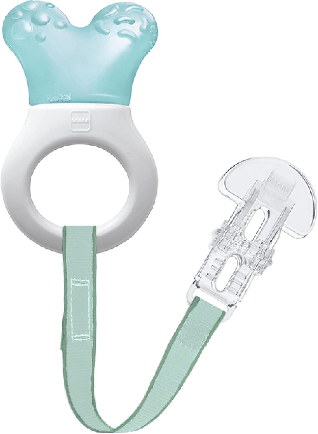 MAM designers have developed a special cooling part to this teether – so that very small babies can also easily reach their molars. The structured surface gives further relief and makes an exciting teether. The teether is extra light-weight and, thanks to the special curved ring shape, easy to pick up and hold –particularly for small babies. Thanks to the innovative combination with clip, the teether doesn’t go missing.