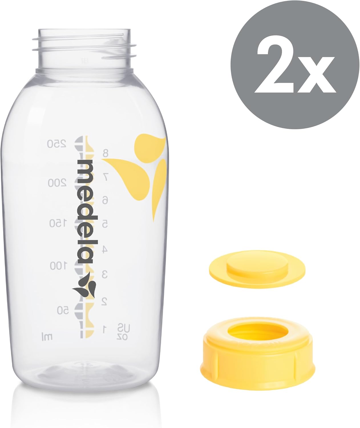 2 x Medela 250 ml BPA-Free Breastmilk Bottles with lids and disc