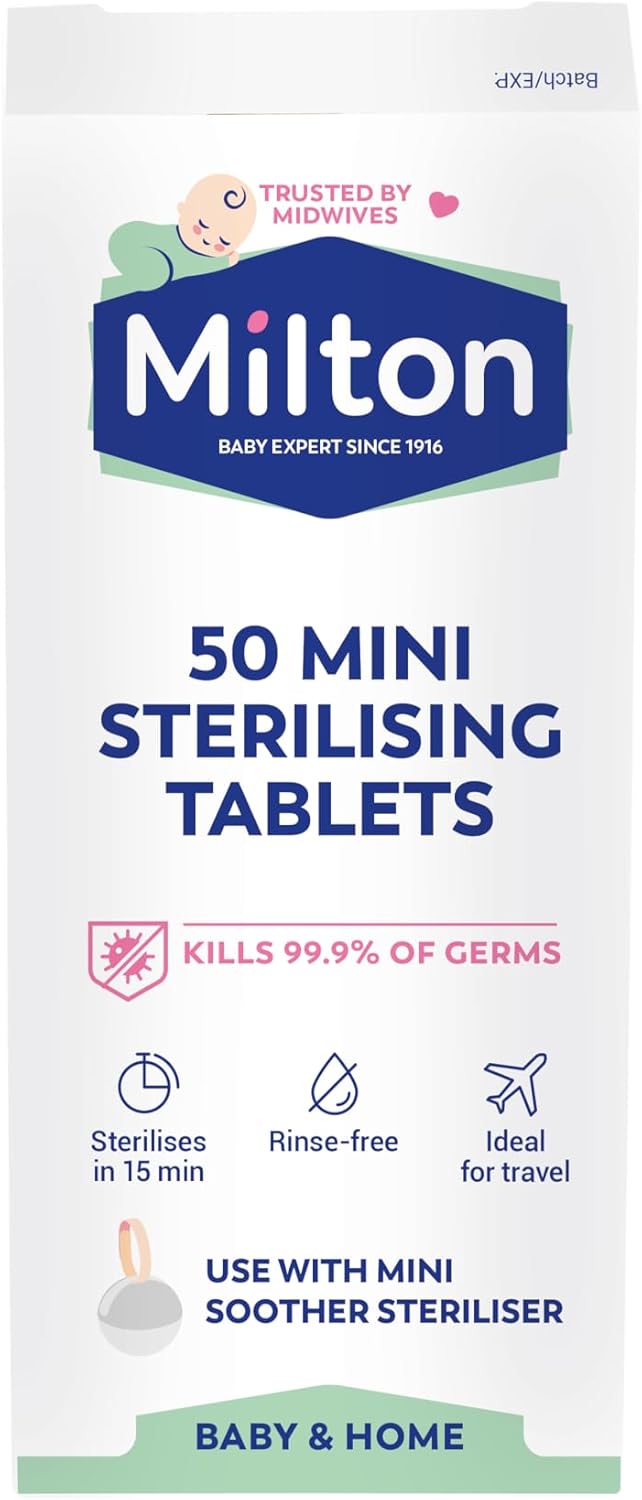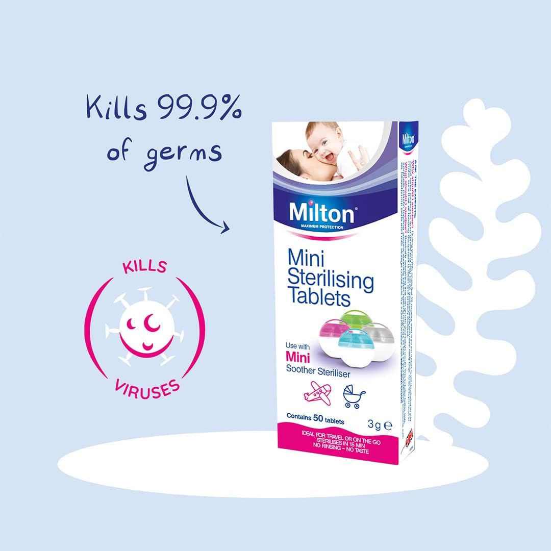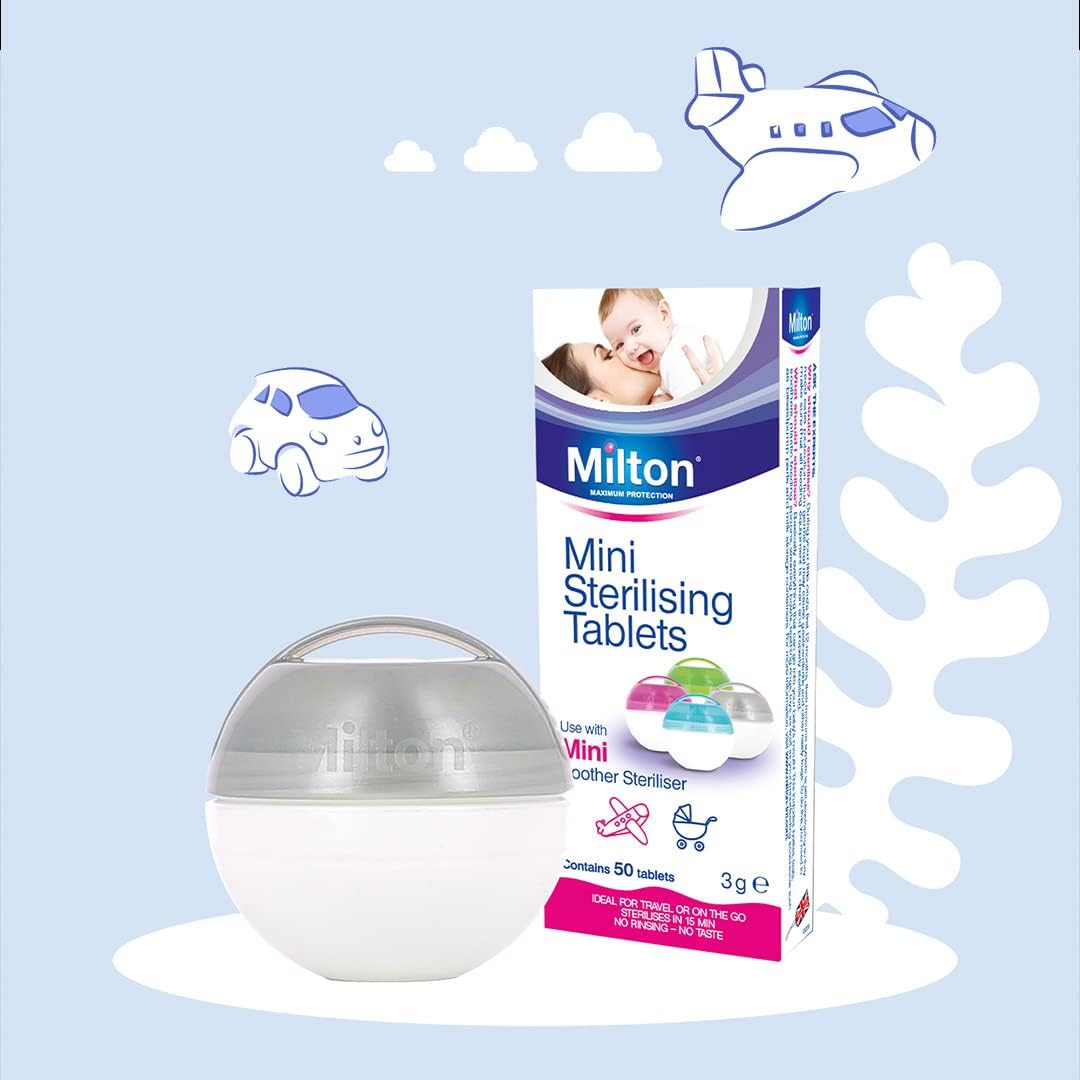These tablets are designed for use with the Milton Mini Soother Steriliser and are ideal for sterilizing small baby items like pacifiers, teething rings, and small breast pump parts when traveling.