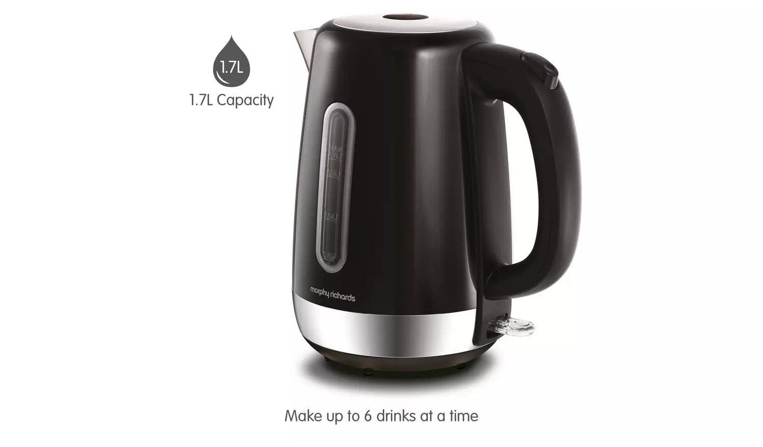 Prepare hot drinks quickly with the Morphy Richards Equip Electric Jug Kettle in black. The stainless steel design features lights when boiling and an easy-view water gauge to monitor levels. With its 1.7 L capacity, you can make up to six cups at once, ideal for family breakfasts or when friends visit. This kettle provides rapid boiling so you won’t have to wait long for your tea or coffee.