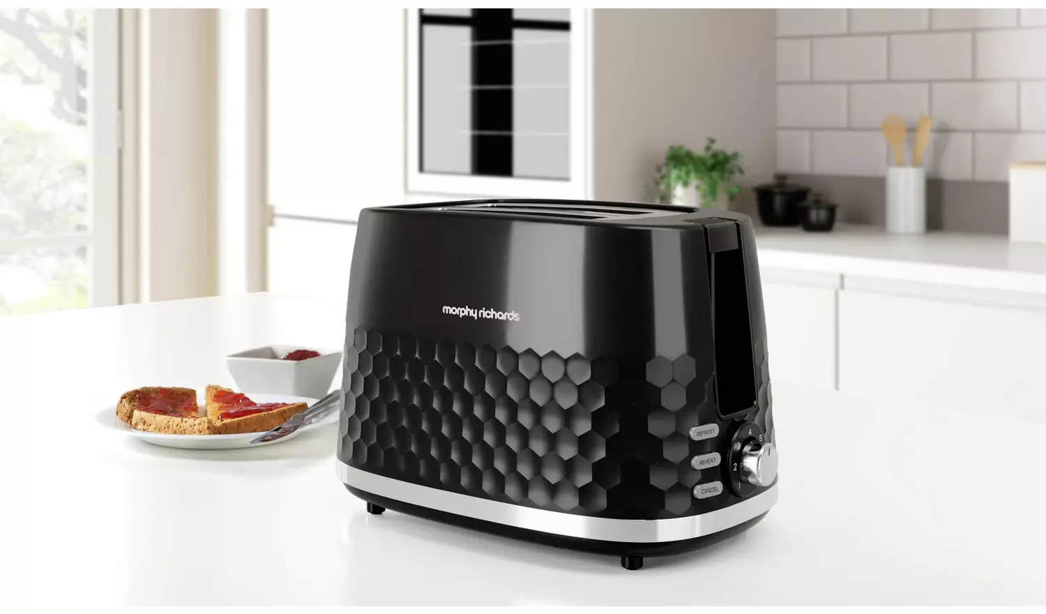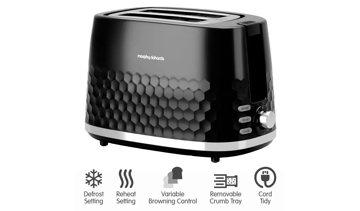 Make great toast every time with the Morphy Richards Hive 2 Slice Toaster in sleek black. Its gloss finish and stylish patterned design adds style to any kitchen, while seven variable settings ensure everyone gets their toast exactly how they like it. The wide slots accommodate different bread sizes, and the convenient lift lever lets you raise smaller items for easy, safe removal.
