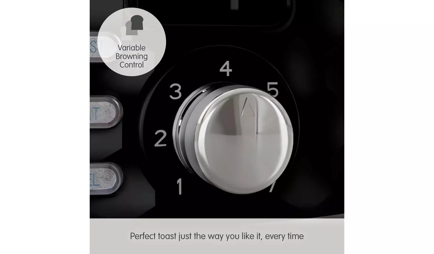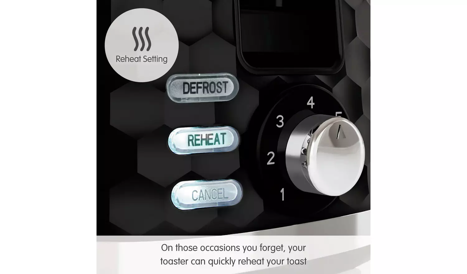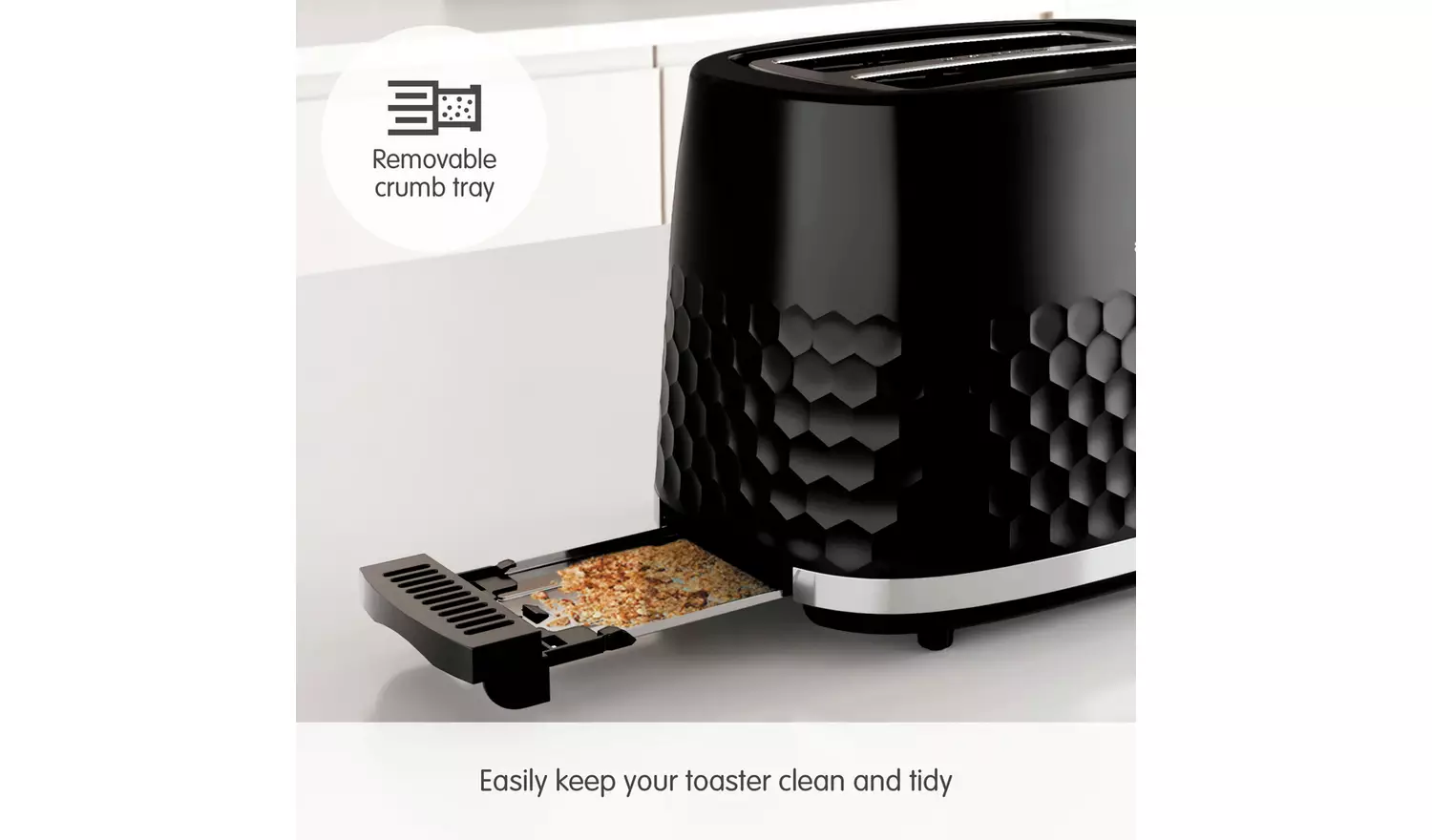 The built-in defrost toasts bread from the freezer, while the reheat setting warms slices without burning. A removable crumb tray makes cleaning easy, and integrated cord storage keeps your worktop tidy.