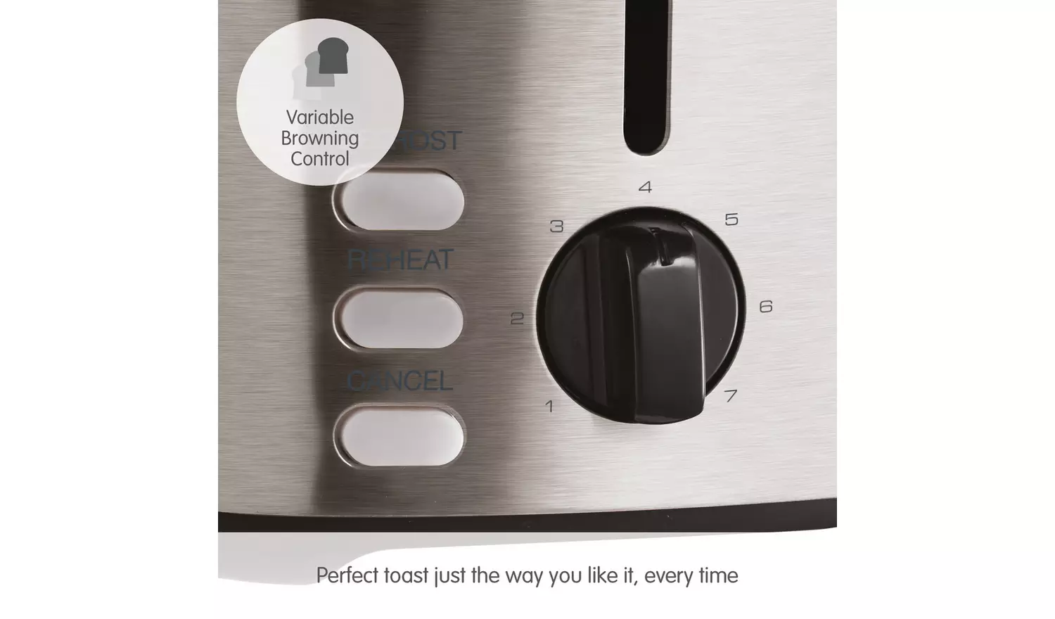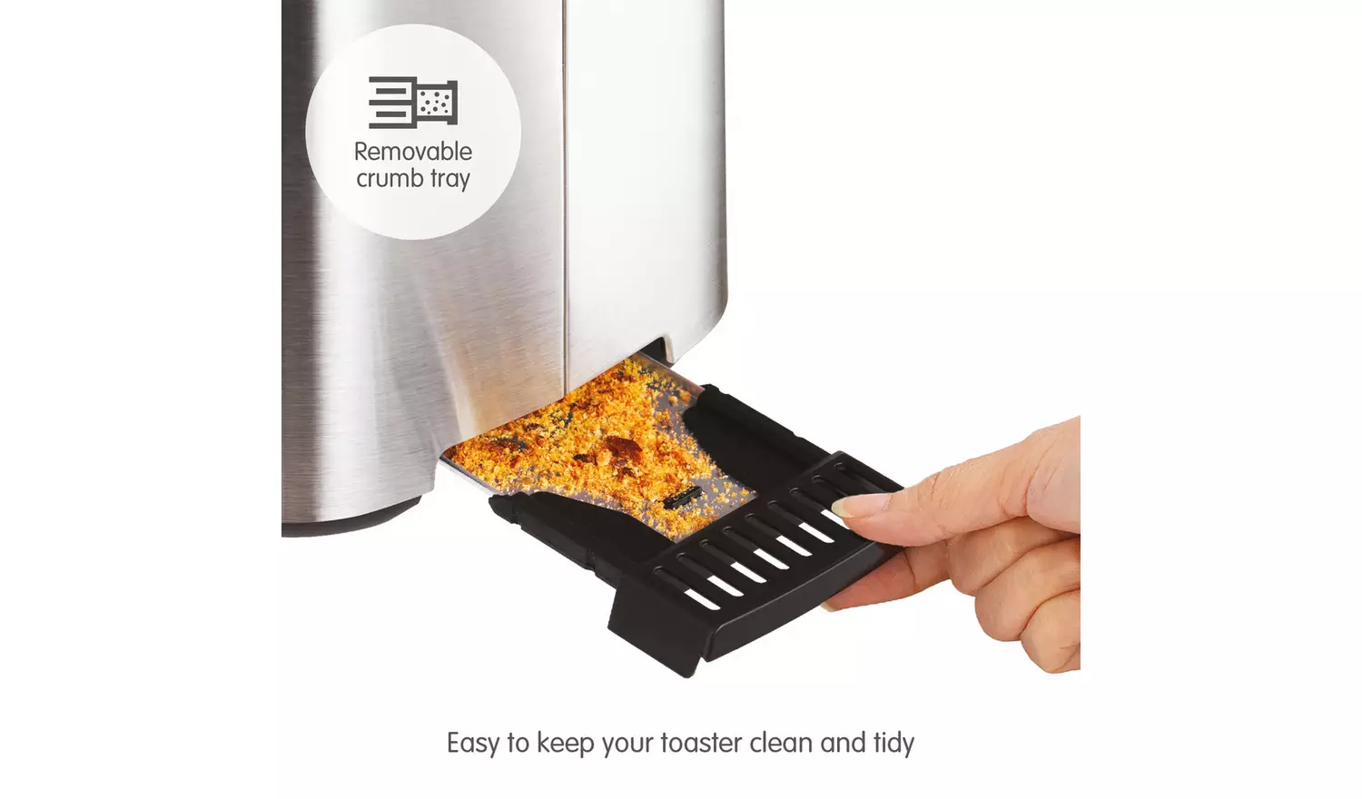 The independent slot operation conserves energy when making one slice, and the defrost and reheat functions handle frozen or cold toast. A removable crumb tray makes cleaning easy, while cord storage keeps your worktop tidy.