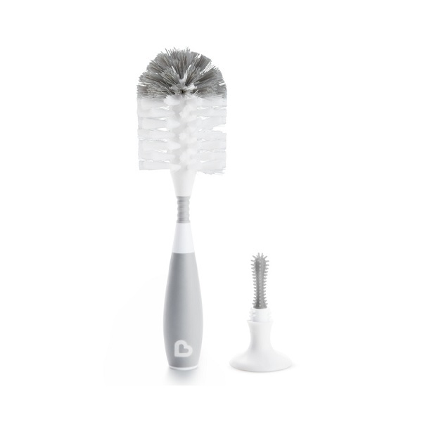 The Munchkin Bristle™ Bottle Brush features a patented suction cup base, so when scrubbing is done, you simply pop it onto the countertop to keep it upright, fast-drying and away from germs. The non-slip handle gives soapy hands a firm grip and the sturdy nylon bristles are tough on dirt, yet gentle on baby’s bottles. Since nobody has time for flinging soapy water around the kitchen, we even developed our bristles to reduce the dreaded splash-back when it pops out of the bottle opening. We know baby bottles come in all shapes and sizes so we added a new flexing neck to help get into every bottle with ease.