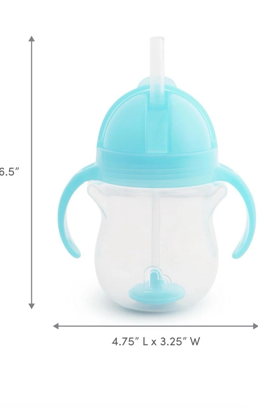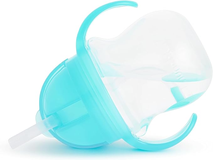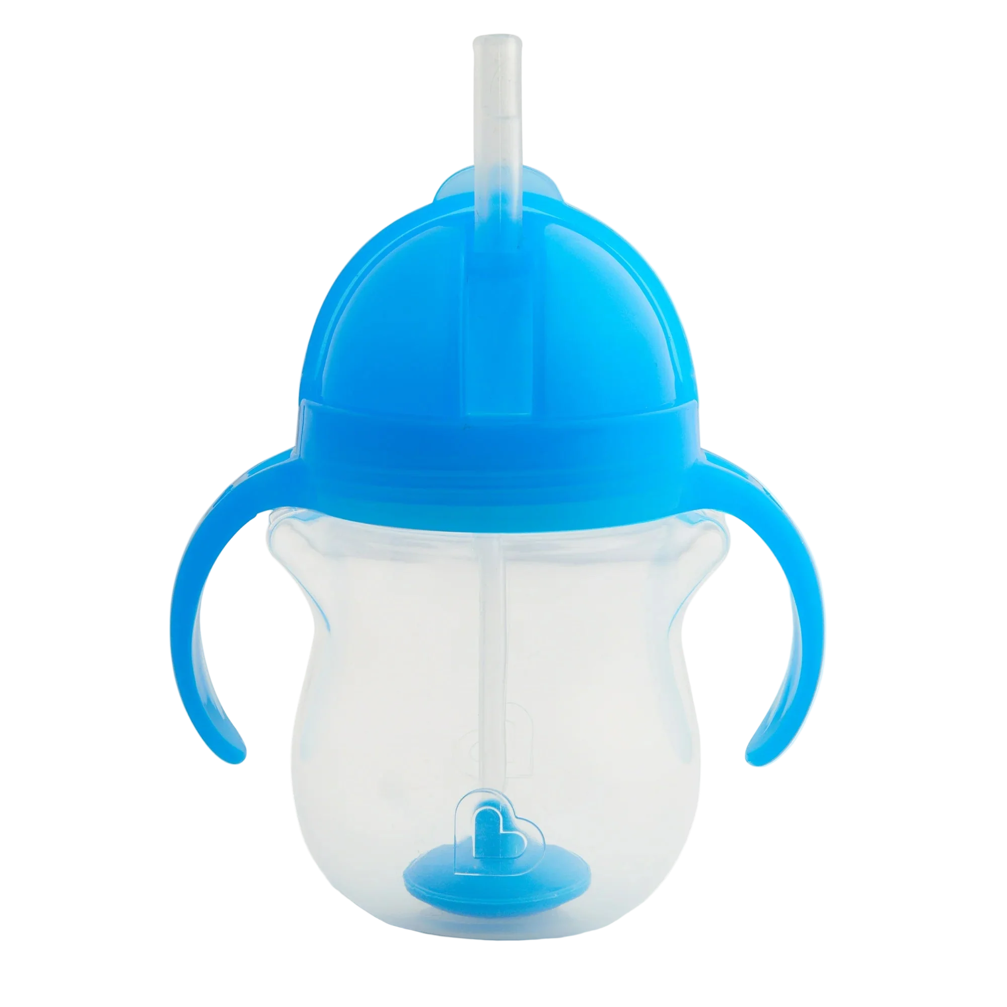 The Munchkin Click Lock Tip & Sip straw cup is designed to help toddlers transition from bottles to cups, allowing them to drink from any angle due to its weighted straw.