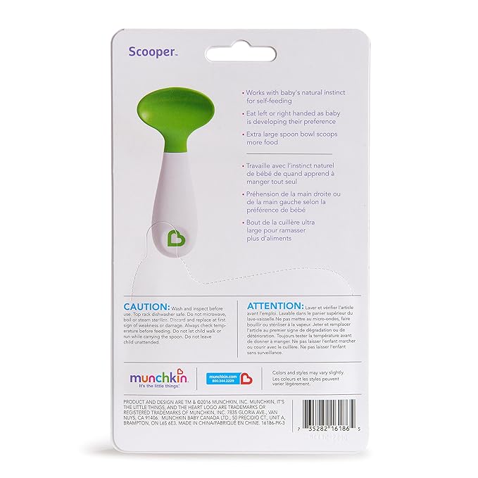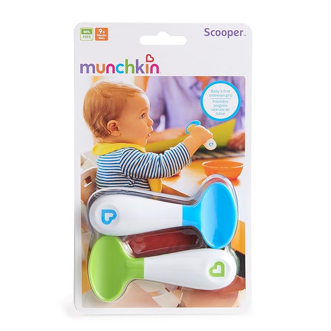 The Munchkin Scooper Spoon 2-Pack in Light Blue and Green is specifically designed for toddlers aged 9 months and older to support their natural self-feeding instincts.