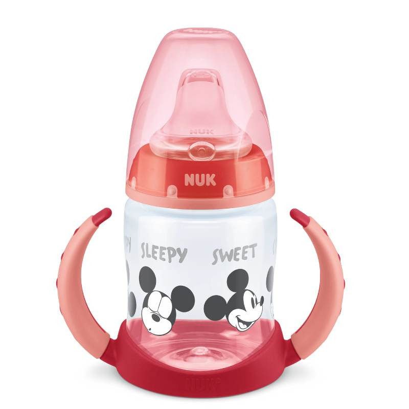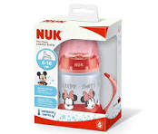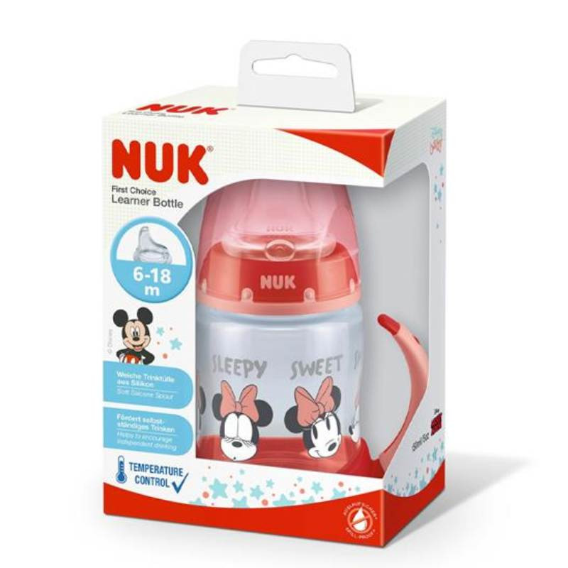 The NUK First Choice Learner Bottle, a Minnie Mouse-themed sippy cup designed for babies around 6-18 months of age.