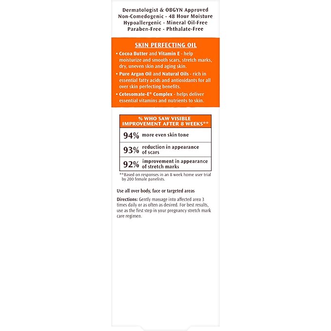 Palmer’s Cocoa Butter Formula with Vitamin E Skin Therapy Oil is an advanced, multi-purpose “dry” oil designed to improve the appearance of scars, stretch marks, dry/damaged skin, uneven skin tone, and aging skin. It is a popular and dermatologist-approved product, available from various online retailers.