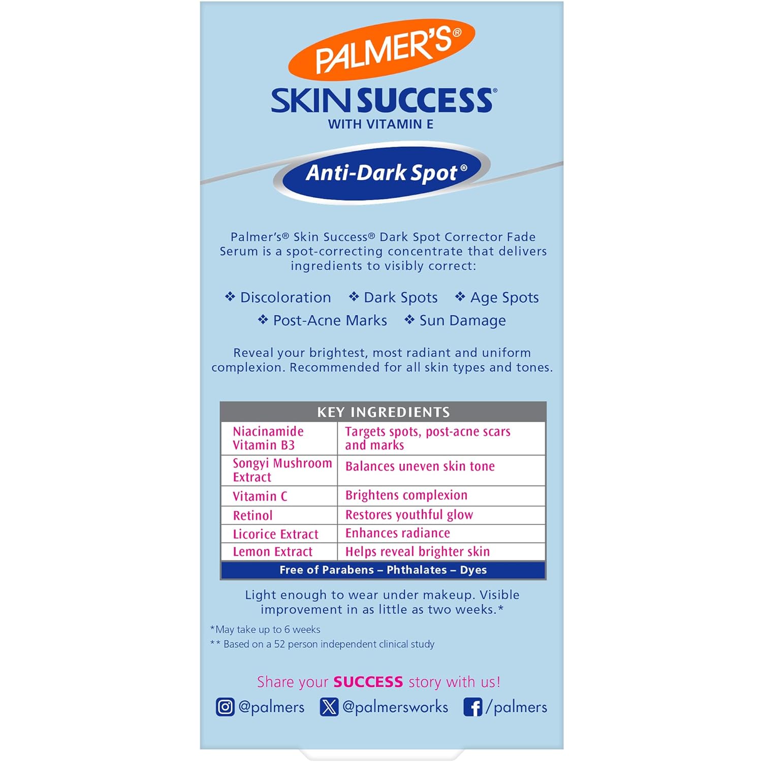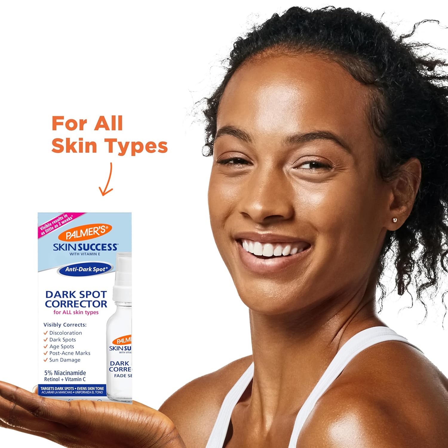 The wish list for skin is long for most people, as manywant to reduce the signs of aging, eliminate dryness, have soft, smooth and supple skin, and avoid worrying about dully, dry skin. Whether you’re concerned about spots, dark marks, discoloration, or an uneven skin tone, you can fade dark marks naturally on your face and discover how to get an even skin tone on your body, too. So why not tackle those problems with products meant to produce a glowing complexion and brighter skin. Using products to reveal how to make your skin glow can also help reduce the appearance of these marks and spots. The Palmer’s Skin Success Dark Spot Corrector can be used to address spots and skin discoloration with visible results in as little as two weeks. This face serum can give you a brighter, more radiant and uniform complexion by effectively correcting discoloration such as dark spots, age spots and uneven skin tone.