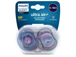 The Philips Avent Air soother is a light and breathable soother that soothes your baby and lets its skin breathe. The Philips Avent ultra air has extra-large holes to keep skin dry, gently ventilated and its lightweight shield is designed for maximum air flow. Every detail of the ultra air soother is designed to feel light and comfortable, including the smooth teat.