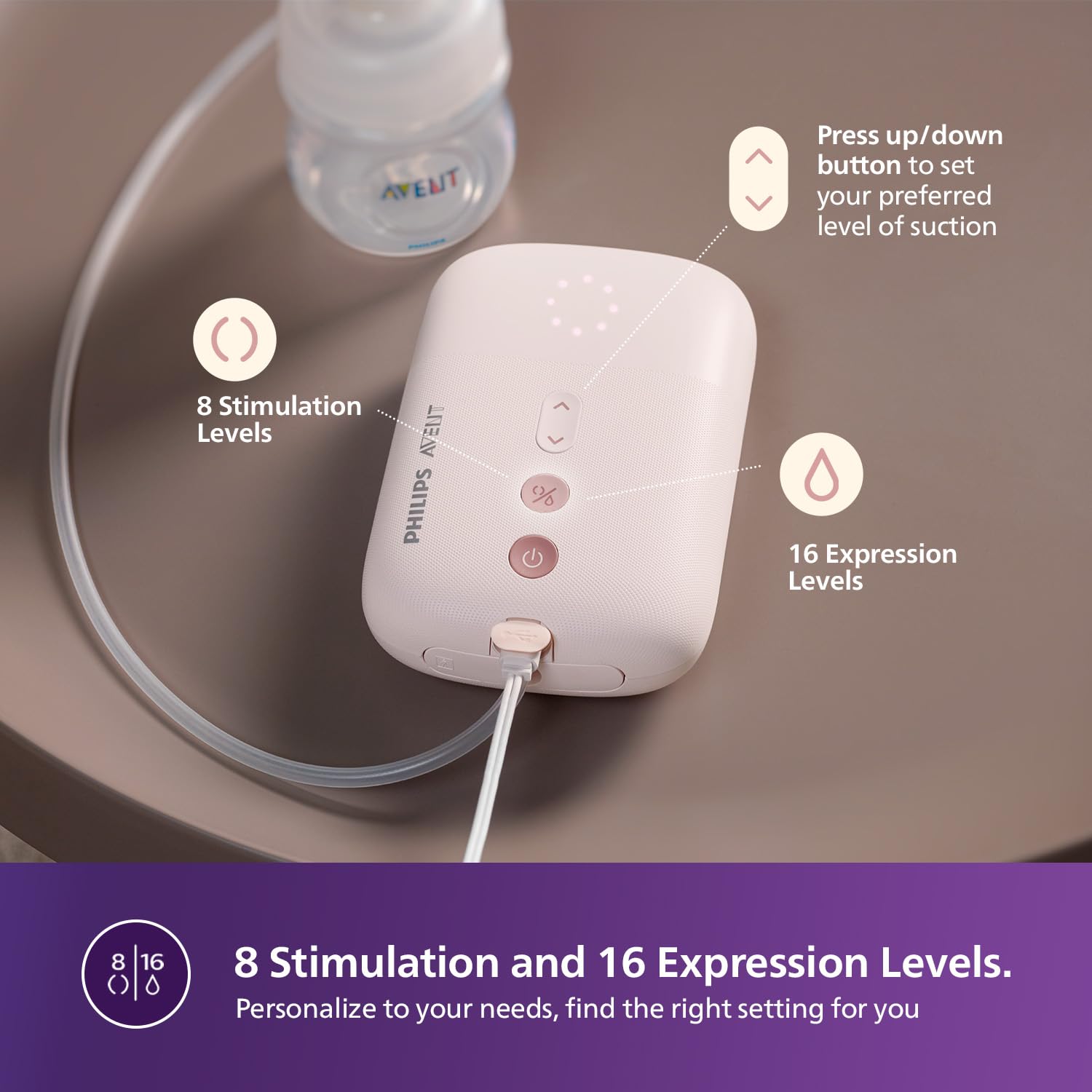 Finely tune every session to your needs with a wide range of stimulation and expression settings. Our breast pump offers 8 stimulation and 16 expression levels for a personalized experience.