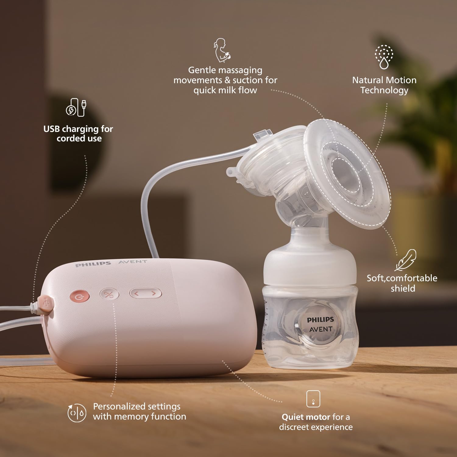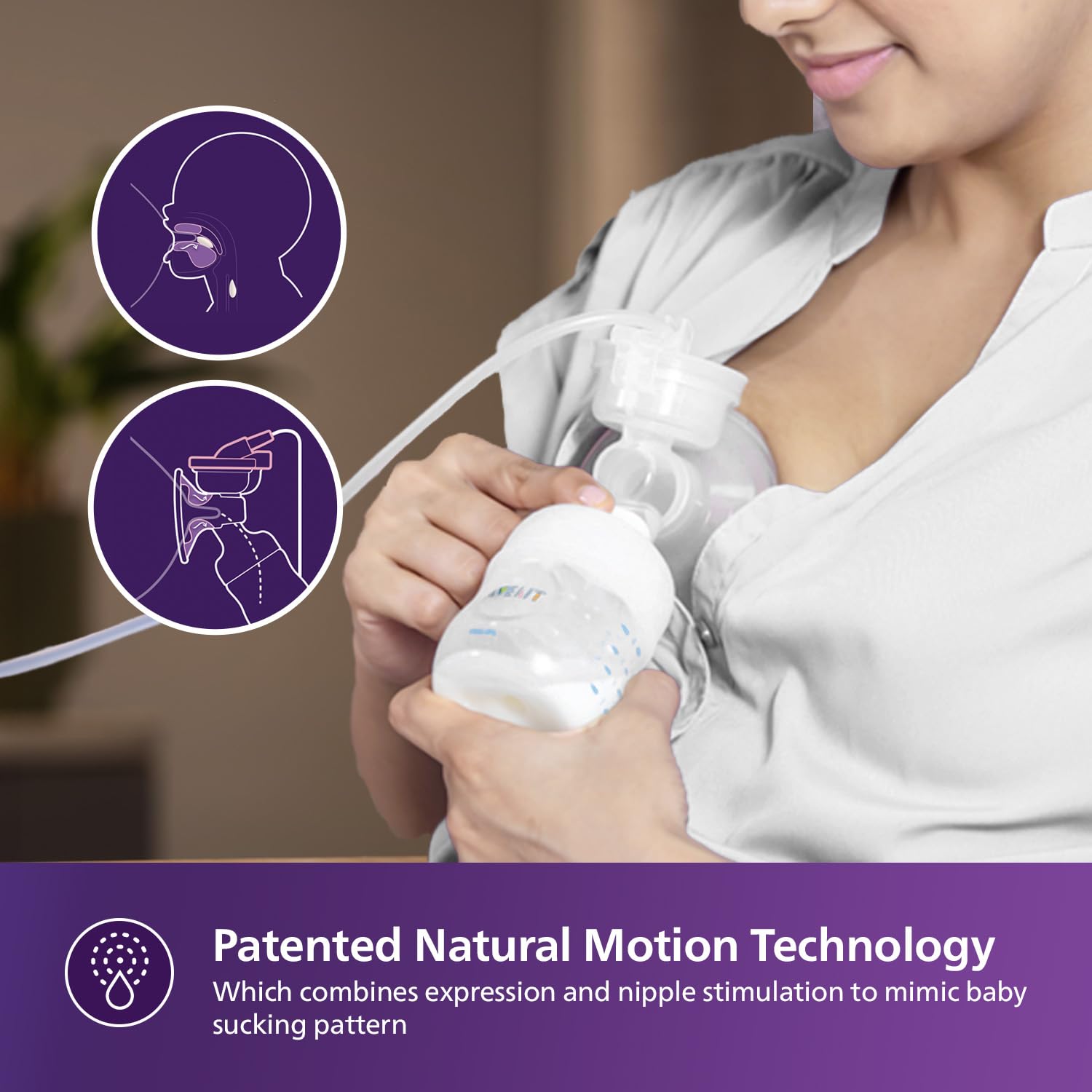 Feel relaxed as you express thanks to a design that lets you sit upright rather than having to lean forward. No need to lean forward, clinically proven comfortable expressing position*. Based on product clinical trial results with 20 participants (2019); 90% of participants find the expressing position comfortable (single electric); 95% of participants find the expressing position comfortable (double electric).