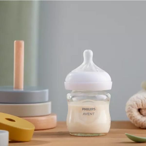 Avent Natural Response Glass Baby Bottle 120ml 0 Months and + is a bottle with a flow 2 nipple, designed to reduce colic and discomfort.