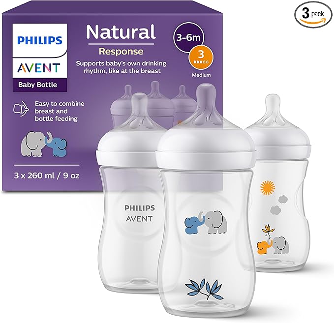 The Philips Avent Natural Response Gift Set with 4 bottles prioritizes your baby’s wellbeing so you can take the best care of yourself. The Natural Response teat features a unique opening and tip that lets your baby control the pace of milk flow, releasing it only when your baby actively drinks—just like during breastfeeding. When pausing to swallow and breathe, no milk flows, making feeding feel as natural as from the breast. Easily combine breast and bottle feeding with a wide, soft, and flexible teat that mimics the shape and feel of a breast. It helps your baby latch on and feed comfortably, using their natural rhythm. The no-drip design helps prevent spills and lost milk, while an integrated anti-colic valve reduces colic and discomfort by directing air away from your baby’s tummy. The ergonomic shape makes it comfortable for parents to hold. Assembly is simple, with only a few parts, while the wide bottle neck makes filling and cleaning easy. The Philips Avent Natural Response Bottle is made from polypropylene, a BPA-free material, and works with all teats and caps from the Natural Response range.