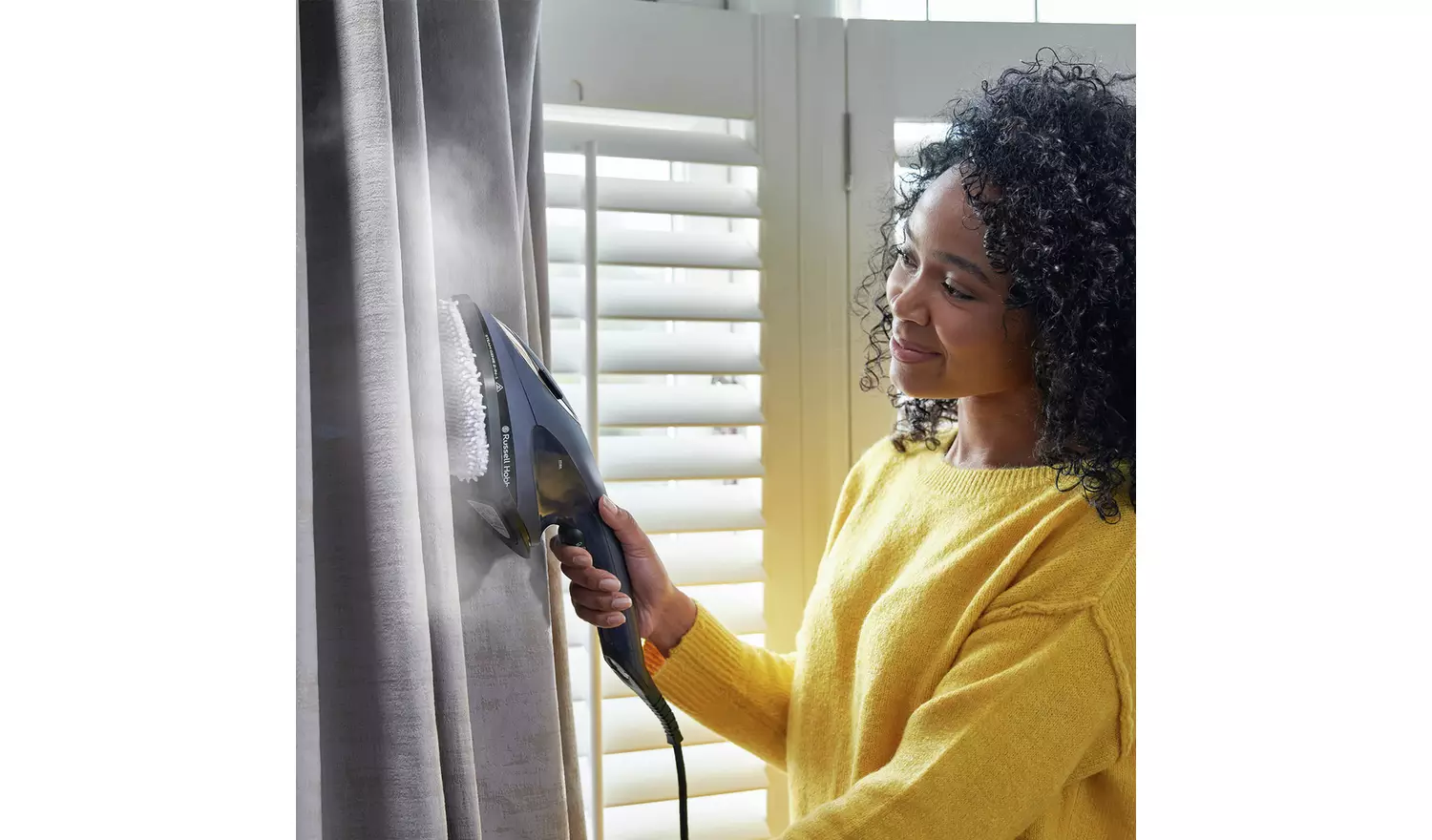 Switch between steaming and ironing modes for delicate and tough fabrics. The 150 mL water tank has ample capacity, while vertical steam refreshes hanging clothes or curtains. Includes fabric attachments, auto shut-off, heat-resistant bag, self-clean, and a 3-year warranty.
