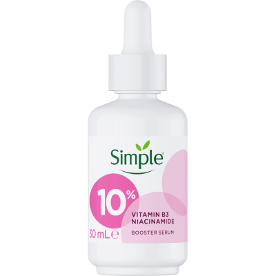 The barcode 8720181157134 identifies the Simple Booster Serum 10% Niacinamide (Vitamin B3), a 30ml skincare product designed to improve skin texture and tone.