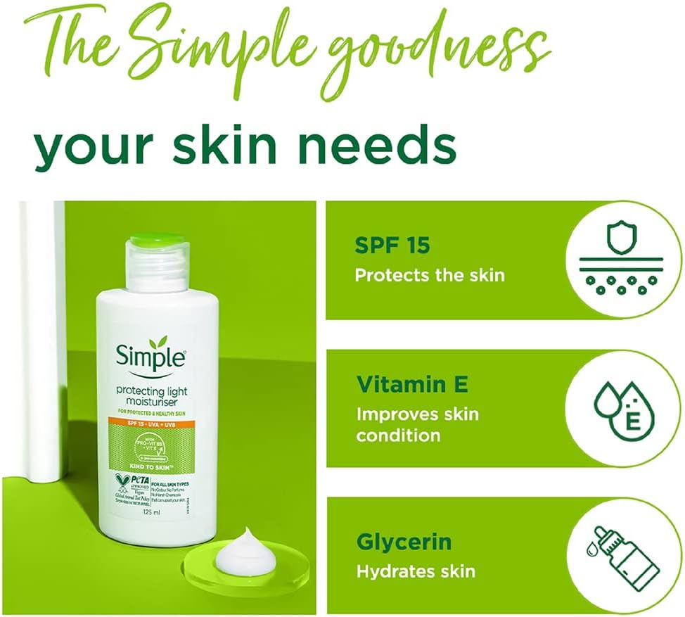 • Simple Kind To Skin Protective Lightweight Moisturizer hydrates skin for up to 12 hours and has SPF 15 protection against UVA and UVB rays.