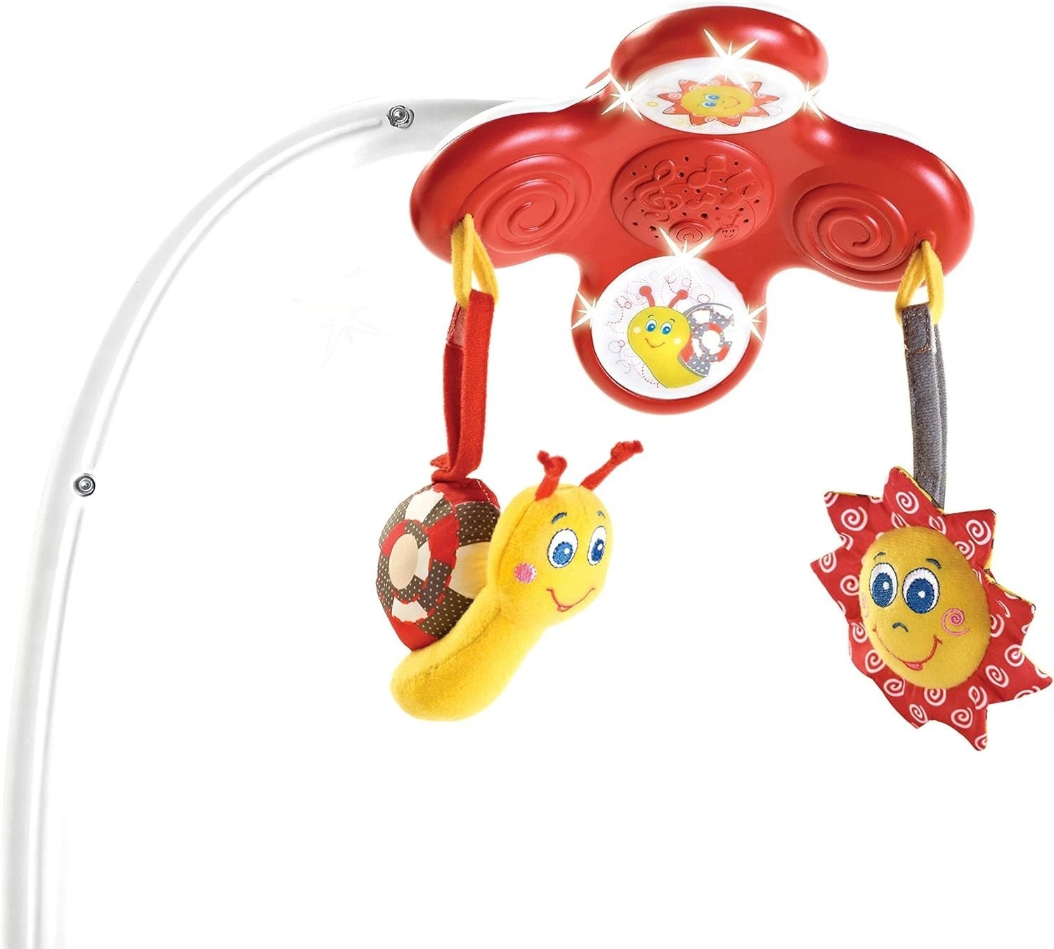 - Electronic toy turns 90° vertical and features light, music and hooks for two removable toy panels