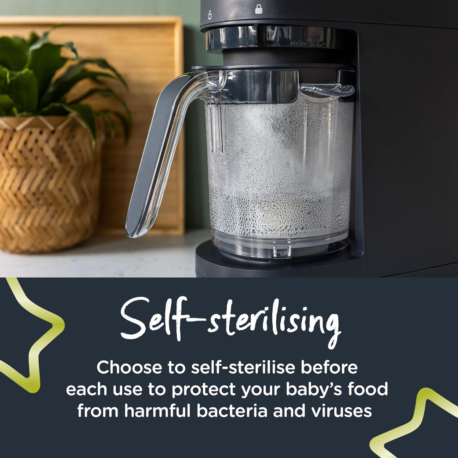 - Self-Sterilising: The unit has a self-sterilising setting to protect against harmful bacteria and viruses, and can also be used to sterilise small accessories like soothers.