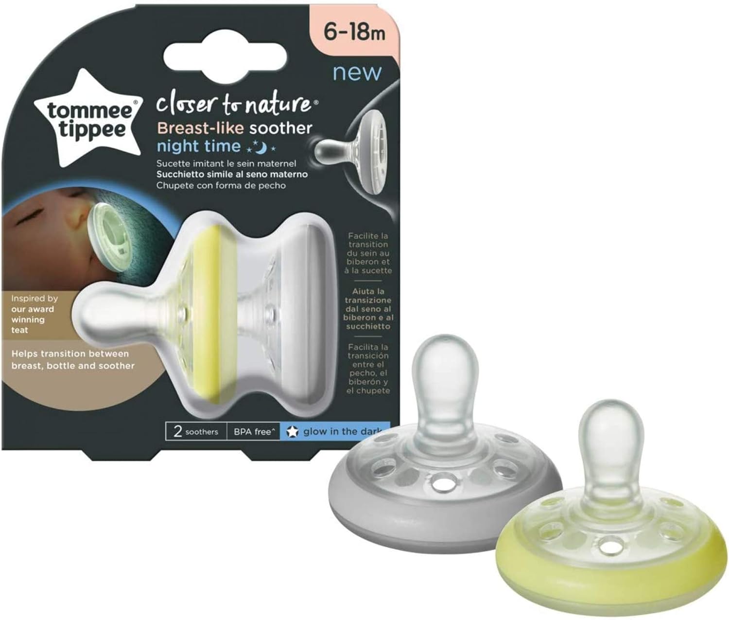 The Tommee Tippee Breast-like Night Soother (6-18m) features a glow-in-the-dark, soft silicone nipple designed to feel and flex like a breast, helping with the transition between breast, bottle, and pacifier. It is available for purchase from various online retailers in multi-packs.