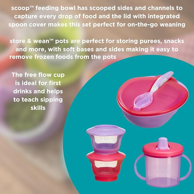 - Scoop Feeding Bowl: This bowl features scooped sides and channels to make it easier to capture every last drop of food. It includes an integrated mashing zone to achieve the right food consistency and a leak-proof lid with an integrated spoon cover, making it ideal for travel.