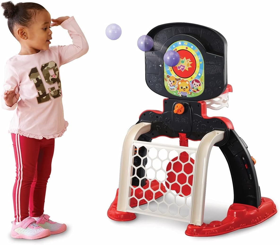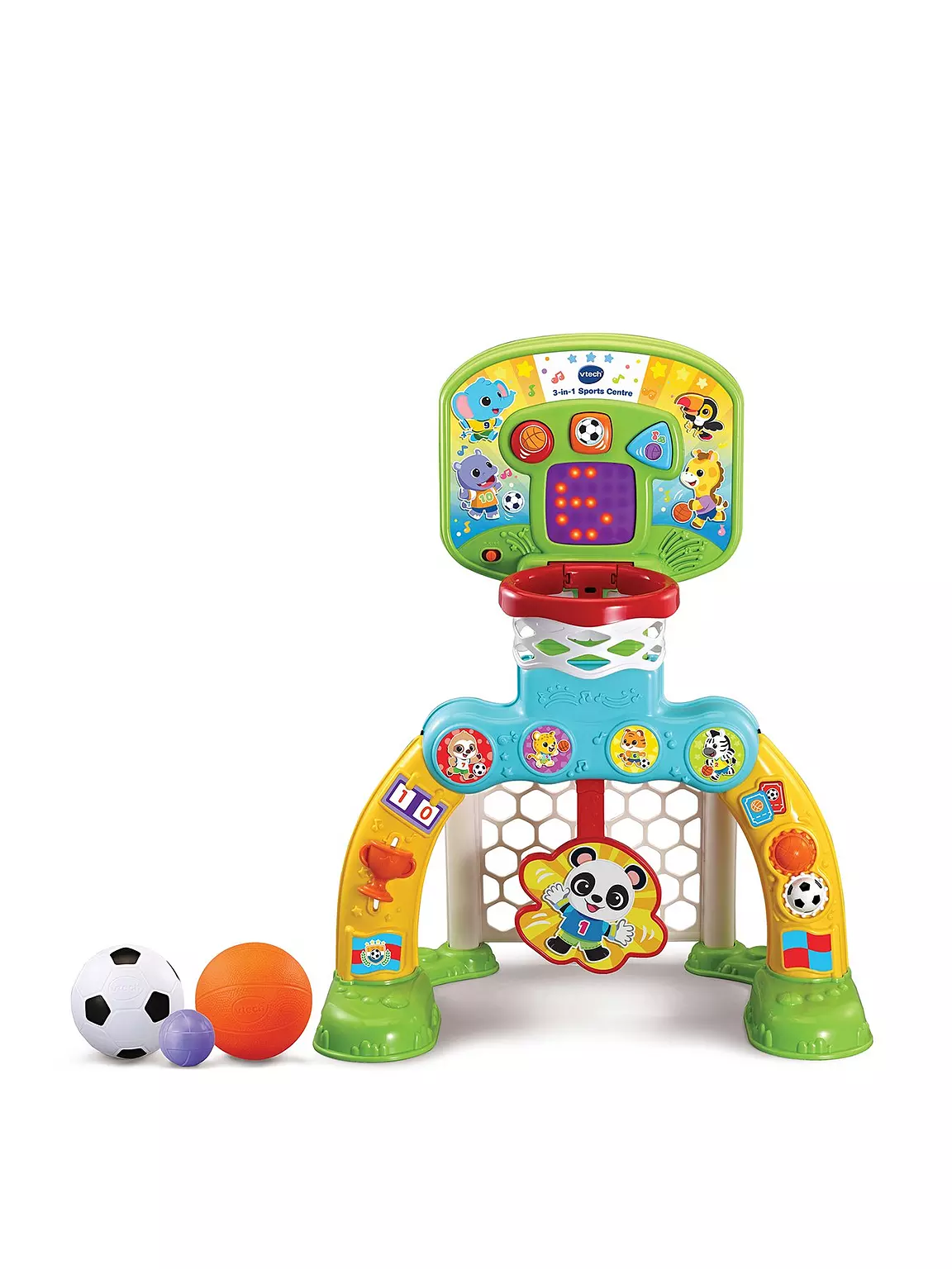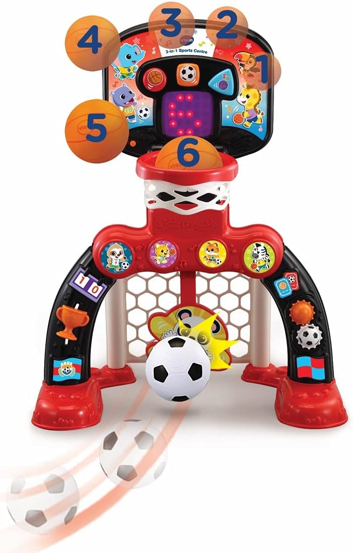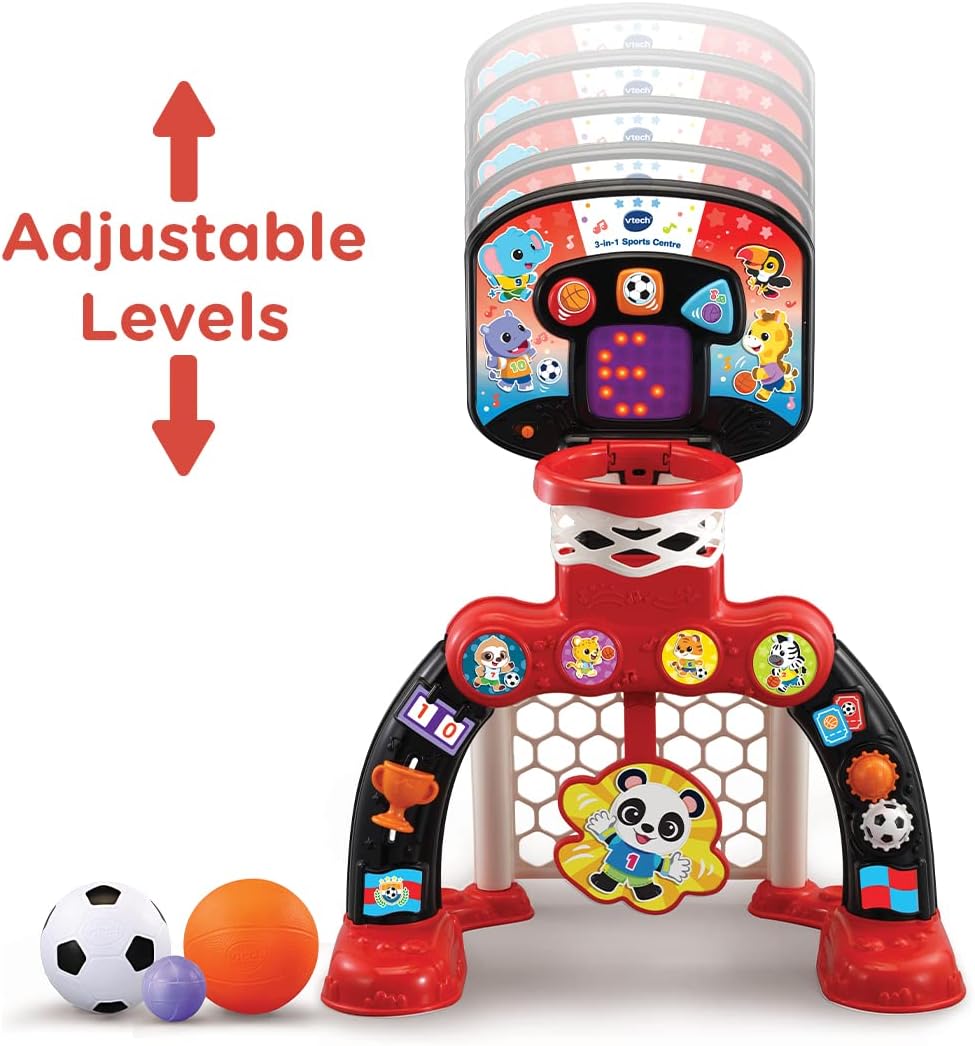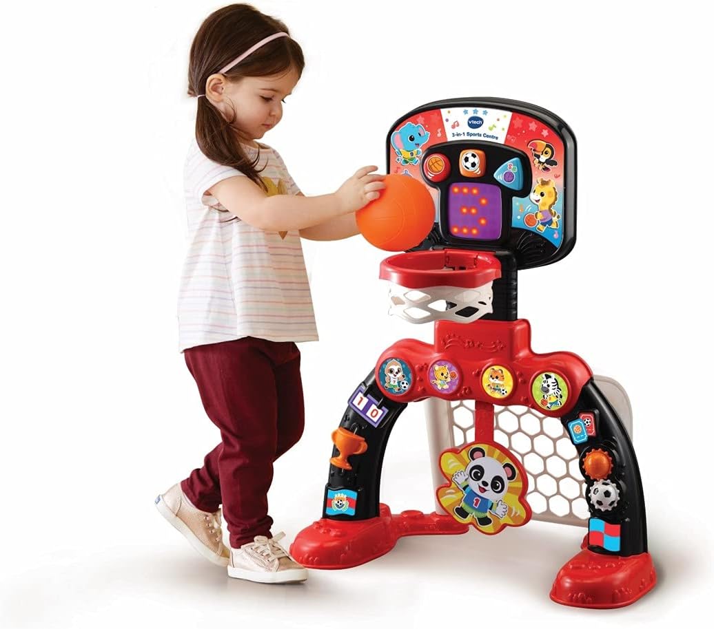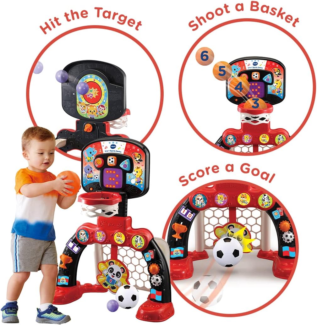 - 3-IN-1 SPORTS CENTRE: This fun and colourful baby toy has load of features to keep children entertained and happy. Shoot a basket, score a goal or hit the target Or explore more features including turning gears and sliding trophy